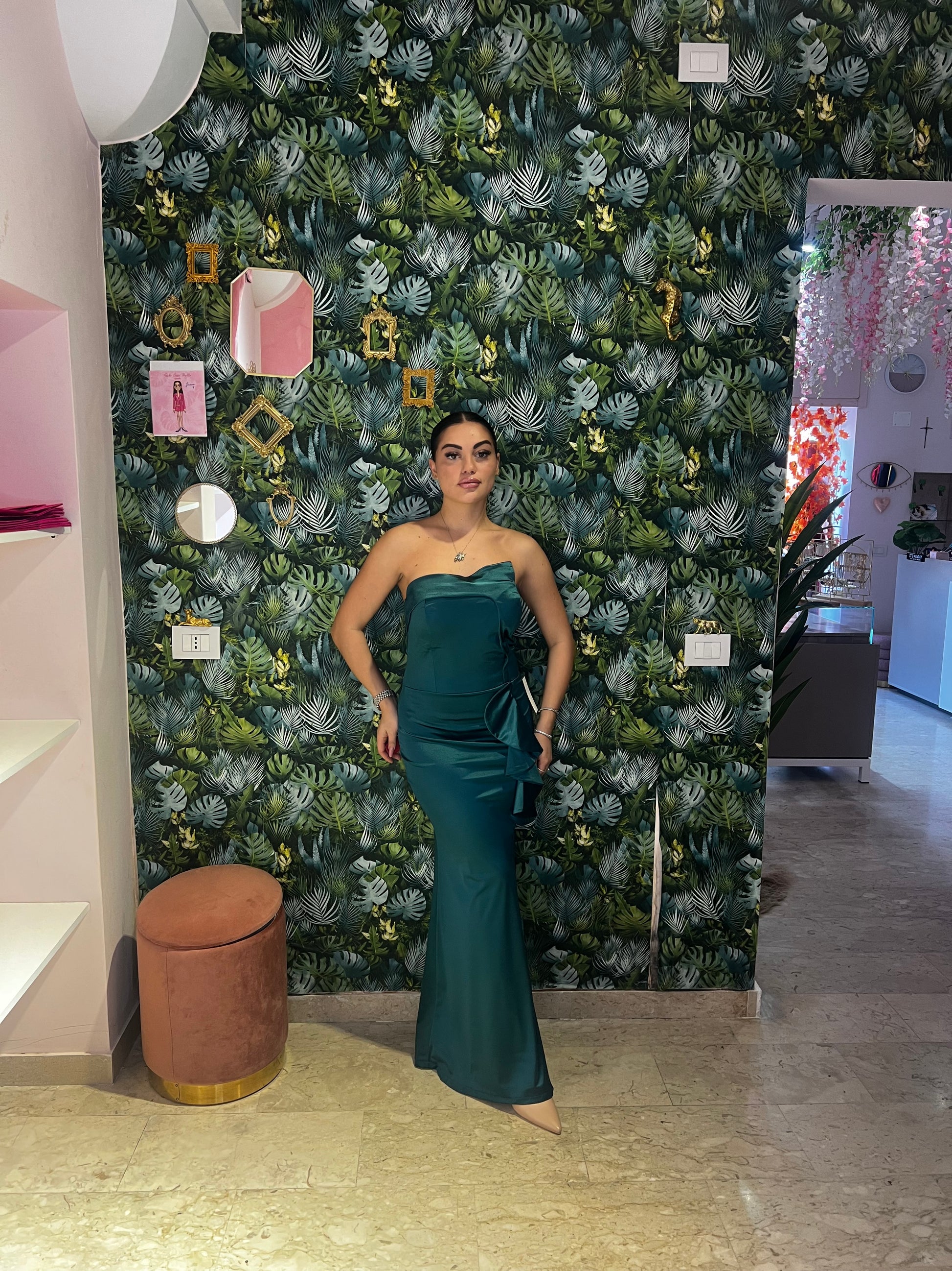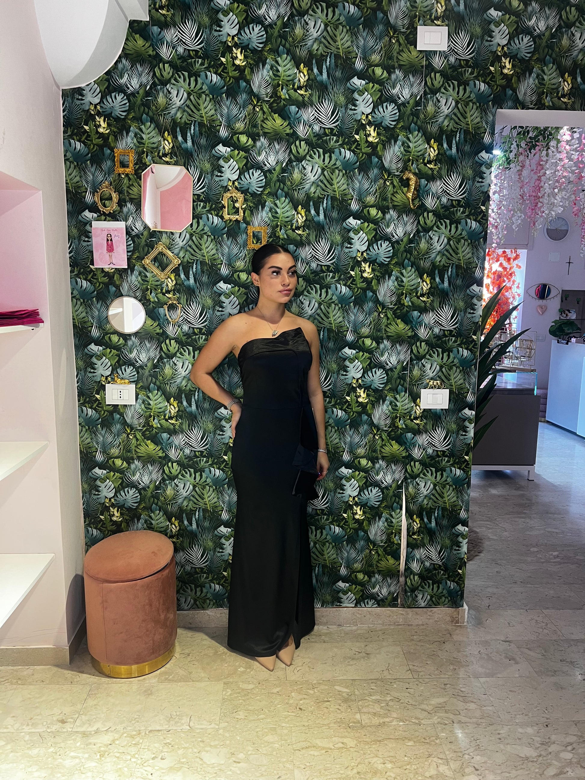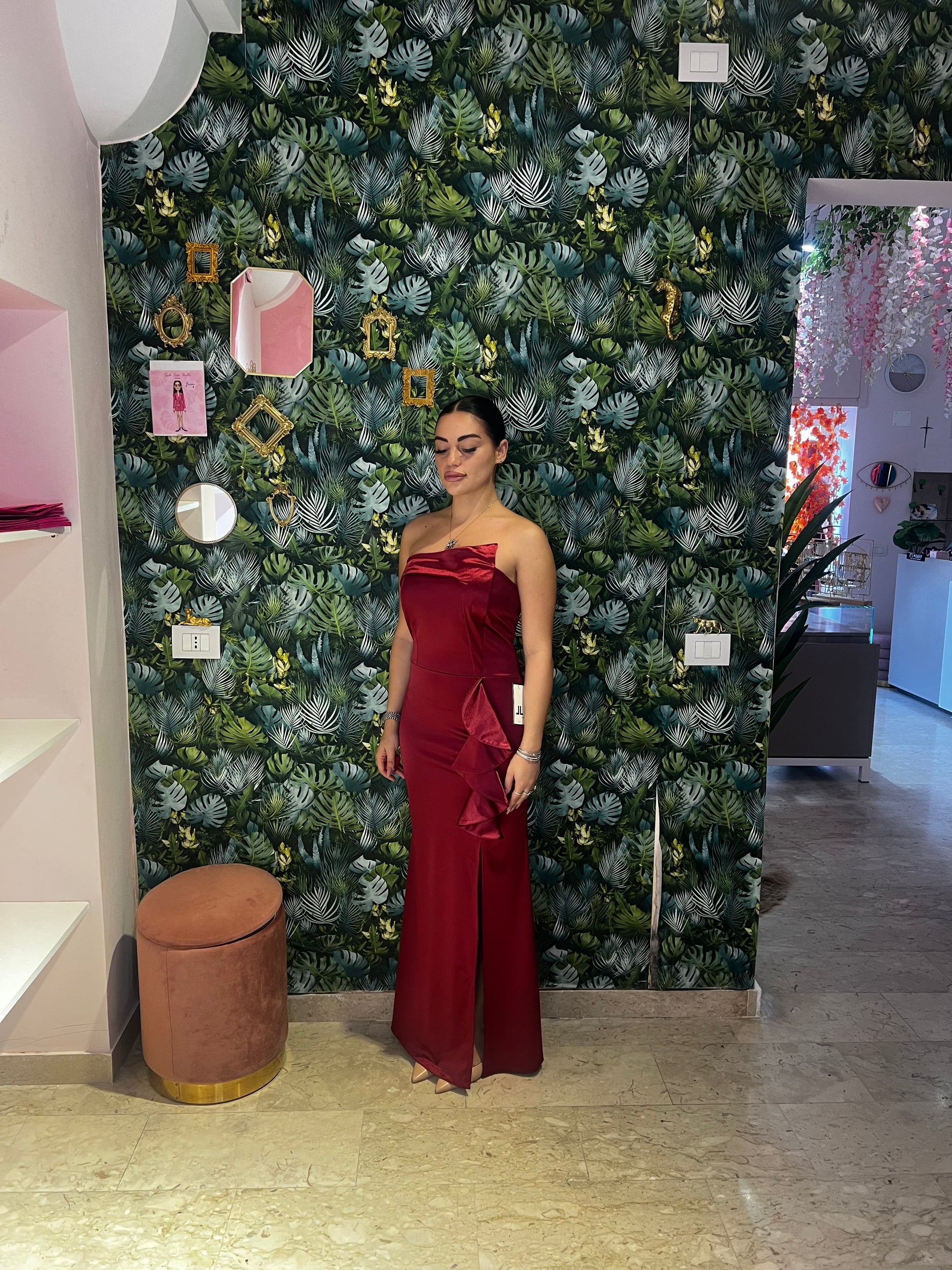 L'abito Agata è un'elegante scelta per cerimonie, realizzato in raso con un dettaglio di rouge sul fianco. Aggiungi un tocco di classe al tuo look con questo abito da cerimonia.
