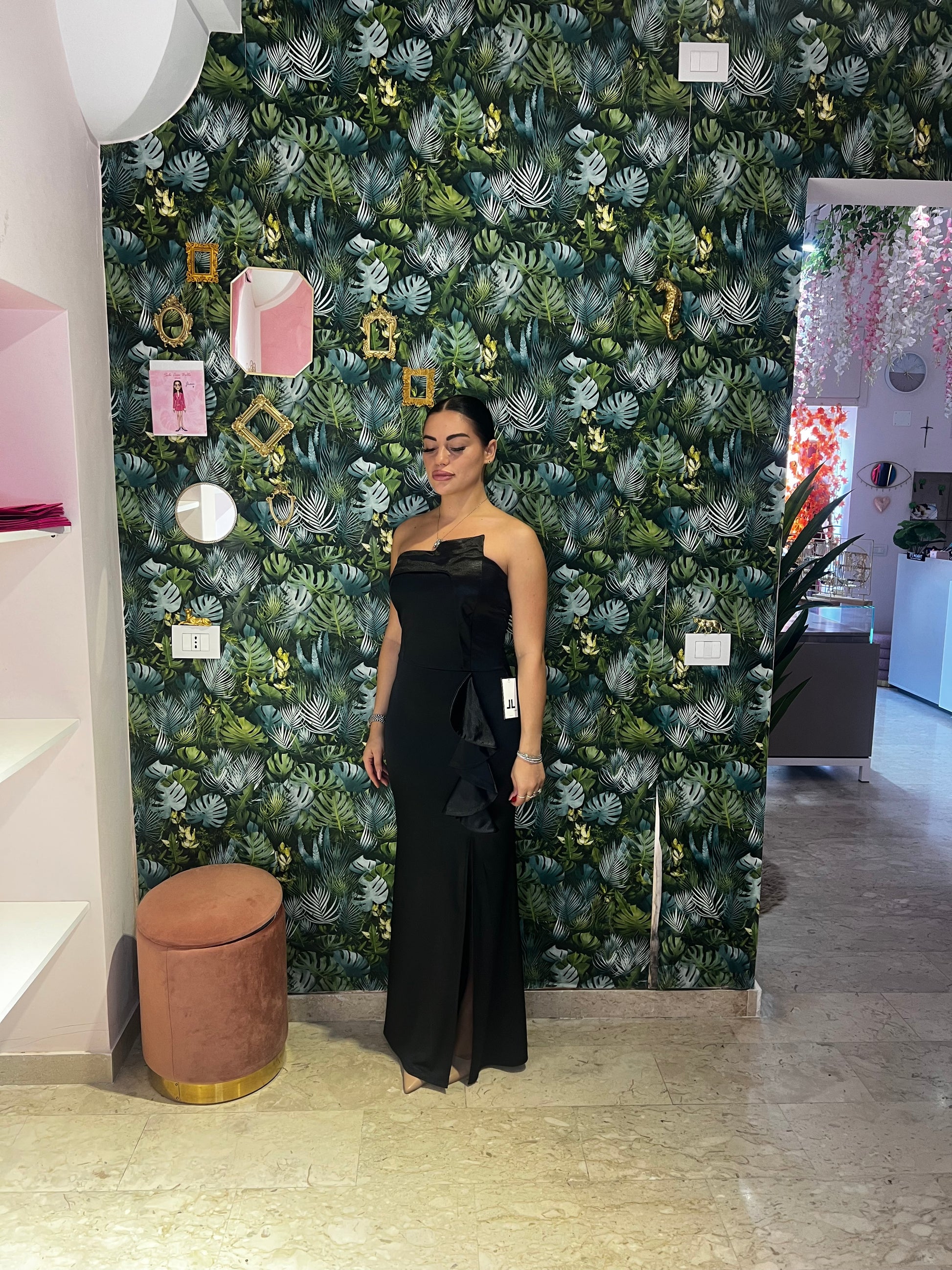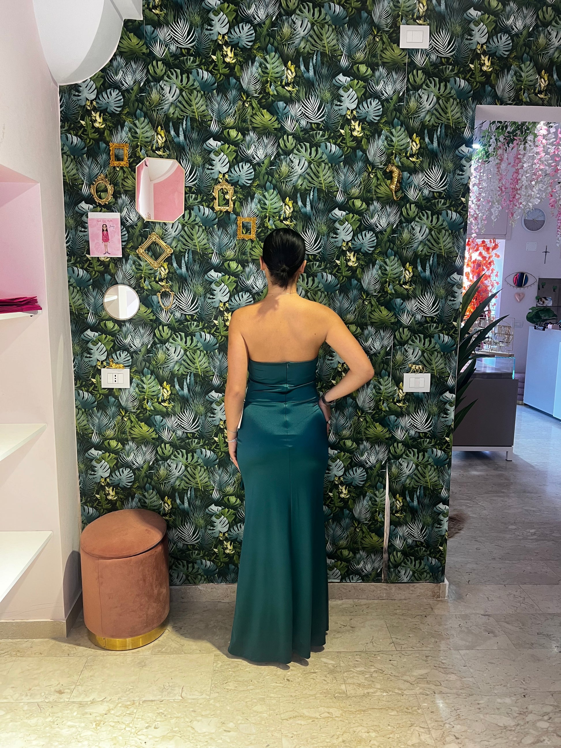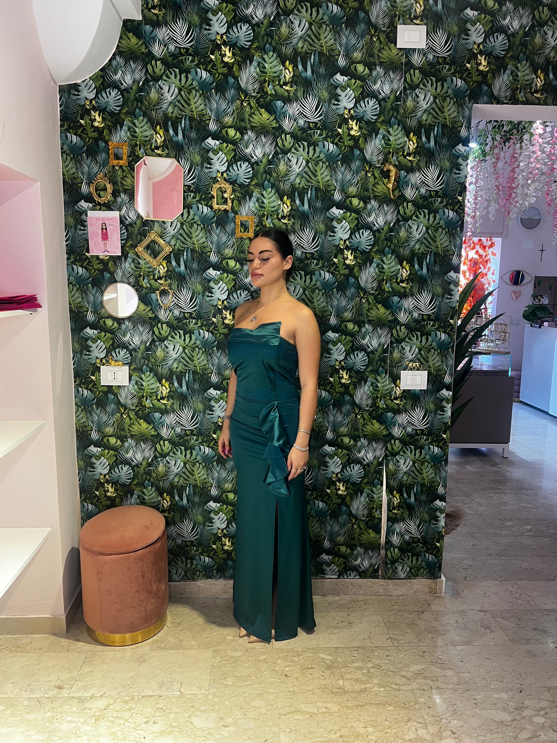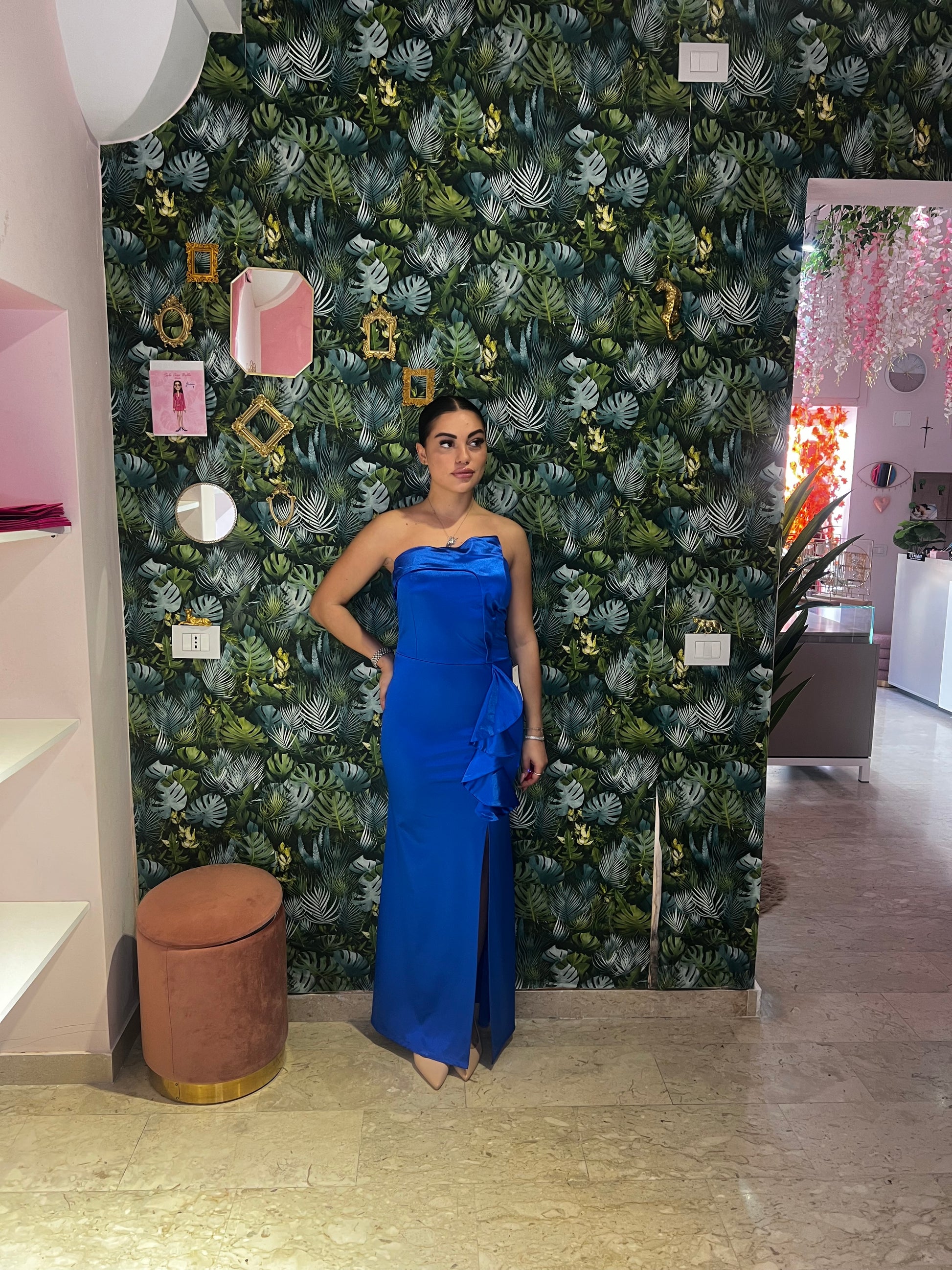 L'abito Agata è un'elegante scelta per cerimonie, realizzato in raso con un dettaglio di rouge sul fianco. Aggiungi un tocco di classe al tuo look con questo abito da cerimonia.