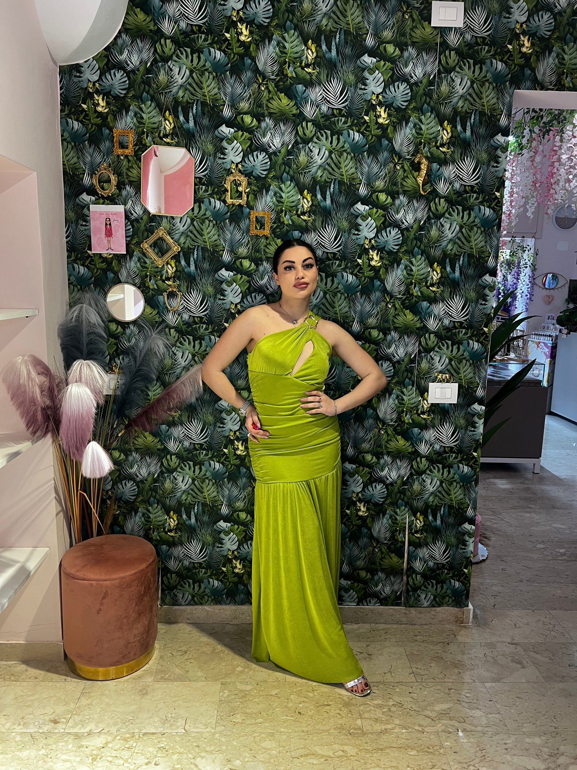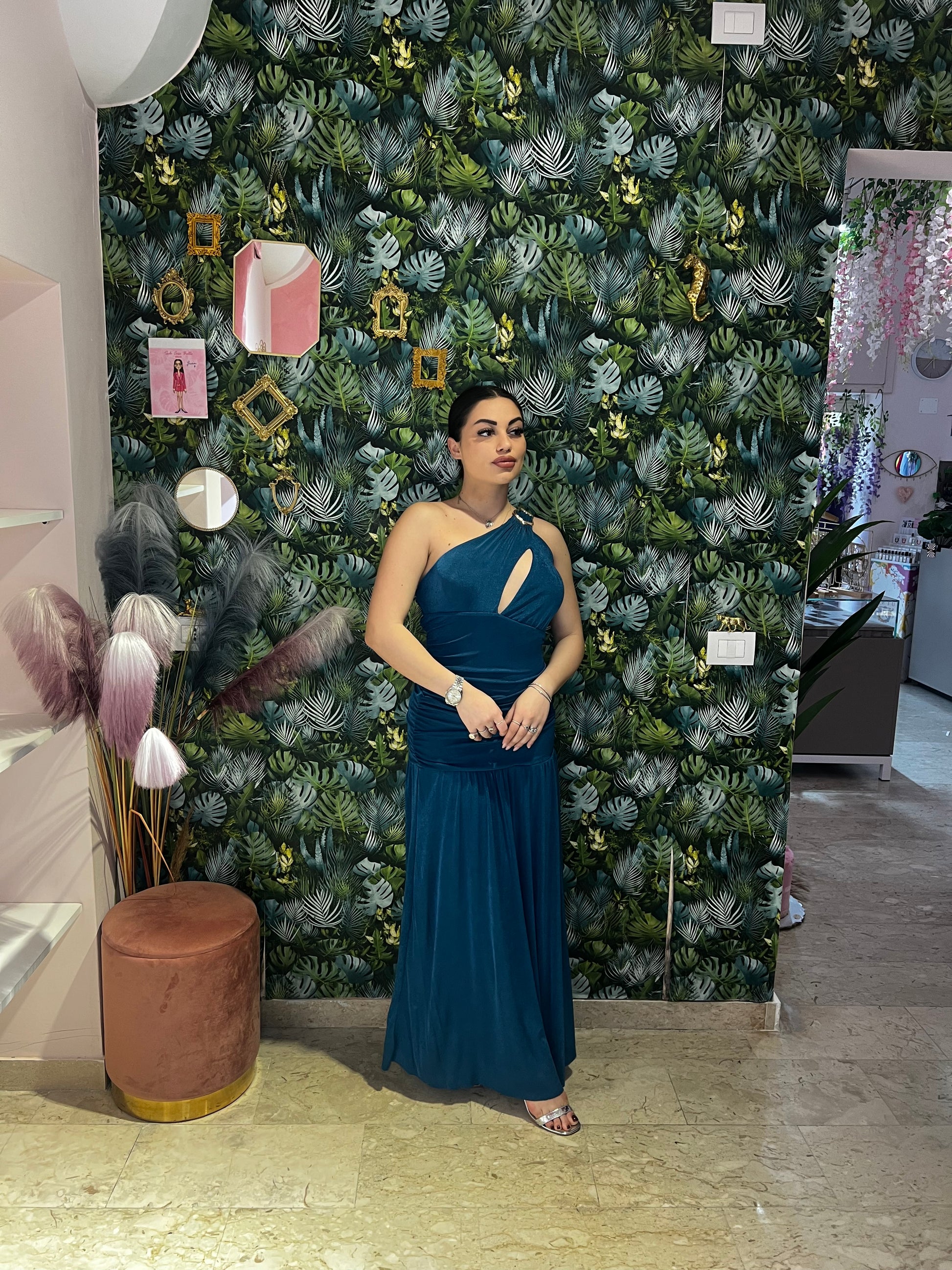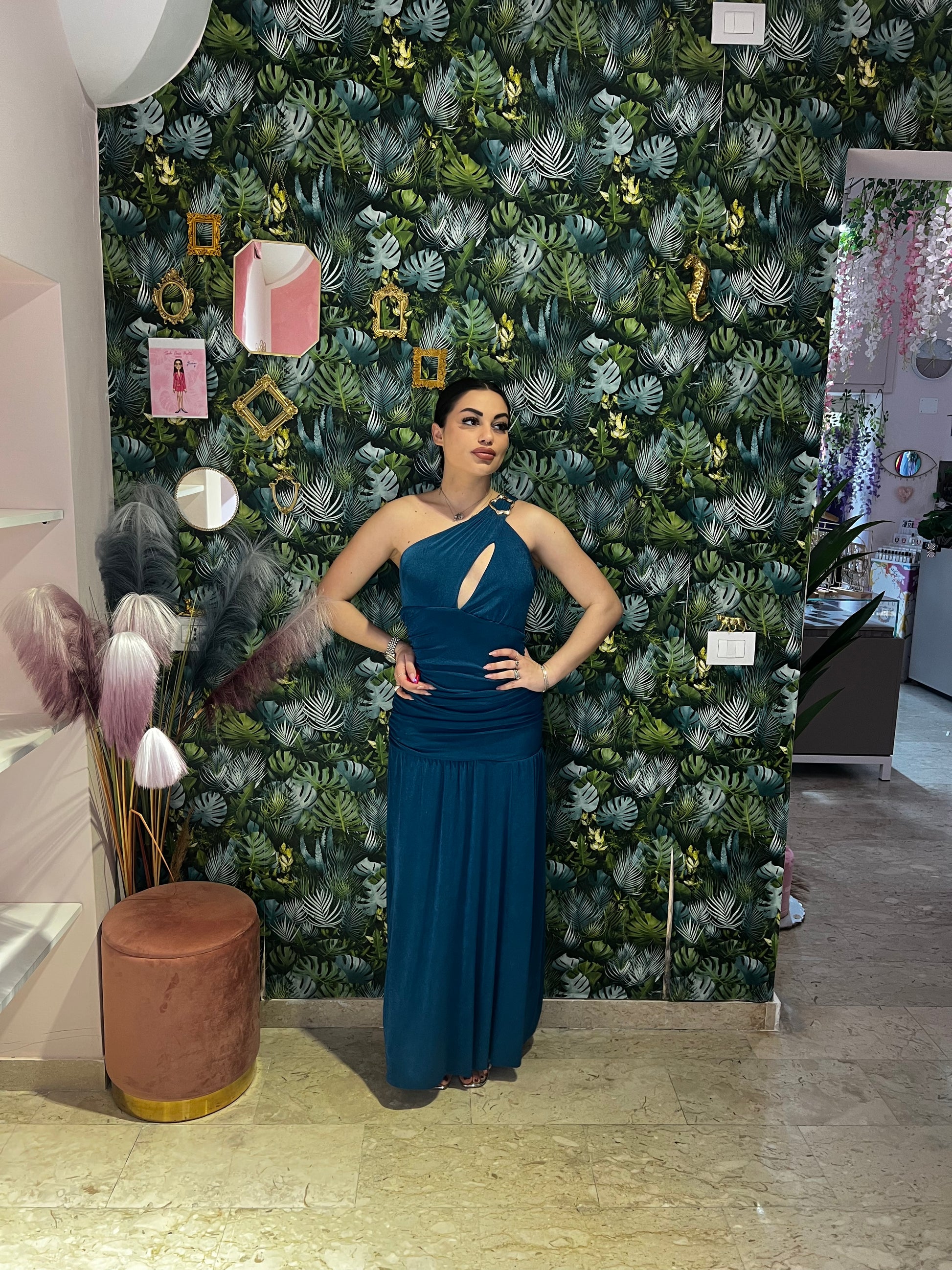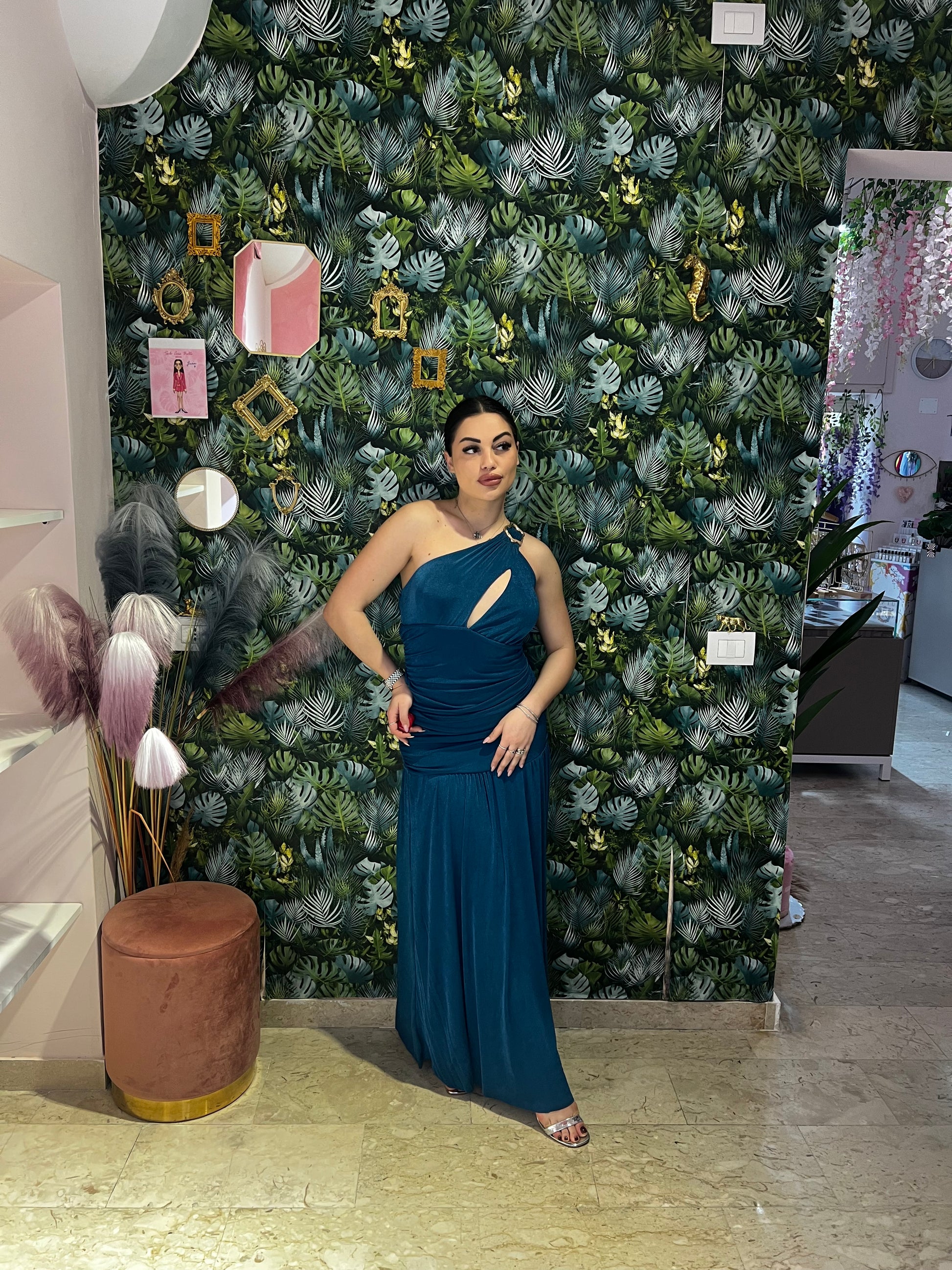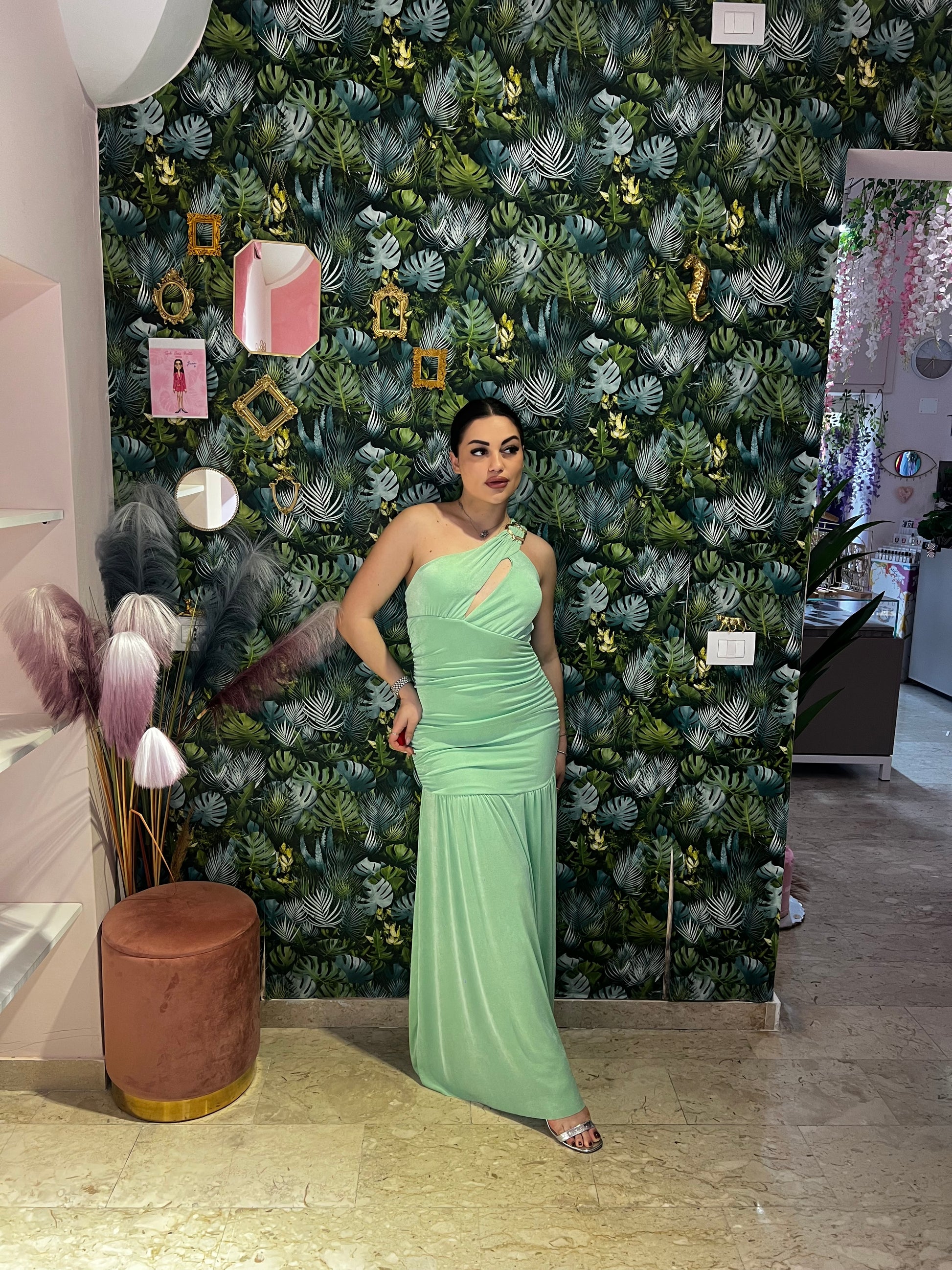 L'abito Artemide è il perfetto mix tra comodità ed eleganza. Con il suo dettaglio monospalla e la scollatura particolare, questo abito è ideale per una cerimonia speciale. Indossalo con sicurezza e lascia che il suo design unico ti faccia risplendere.