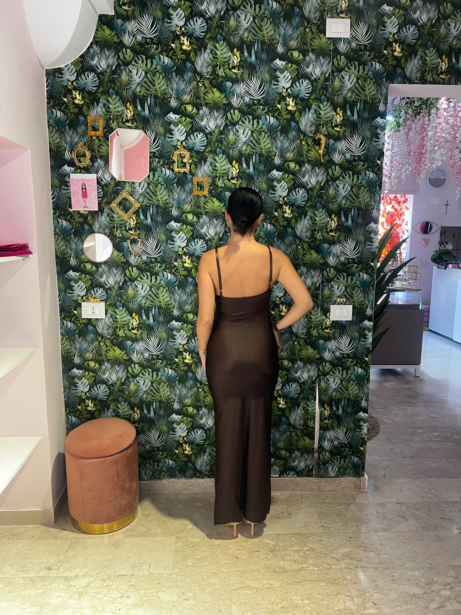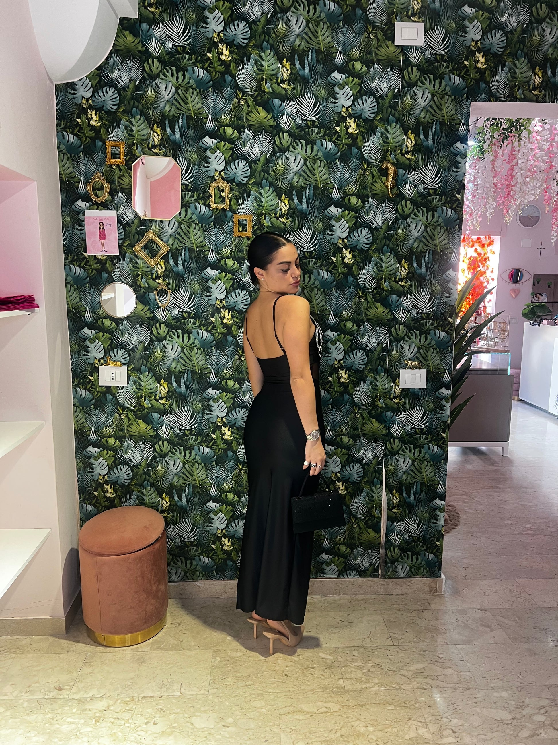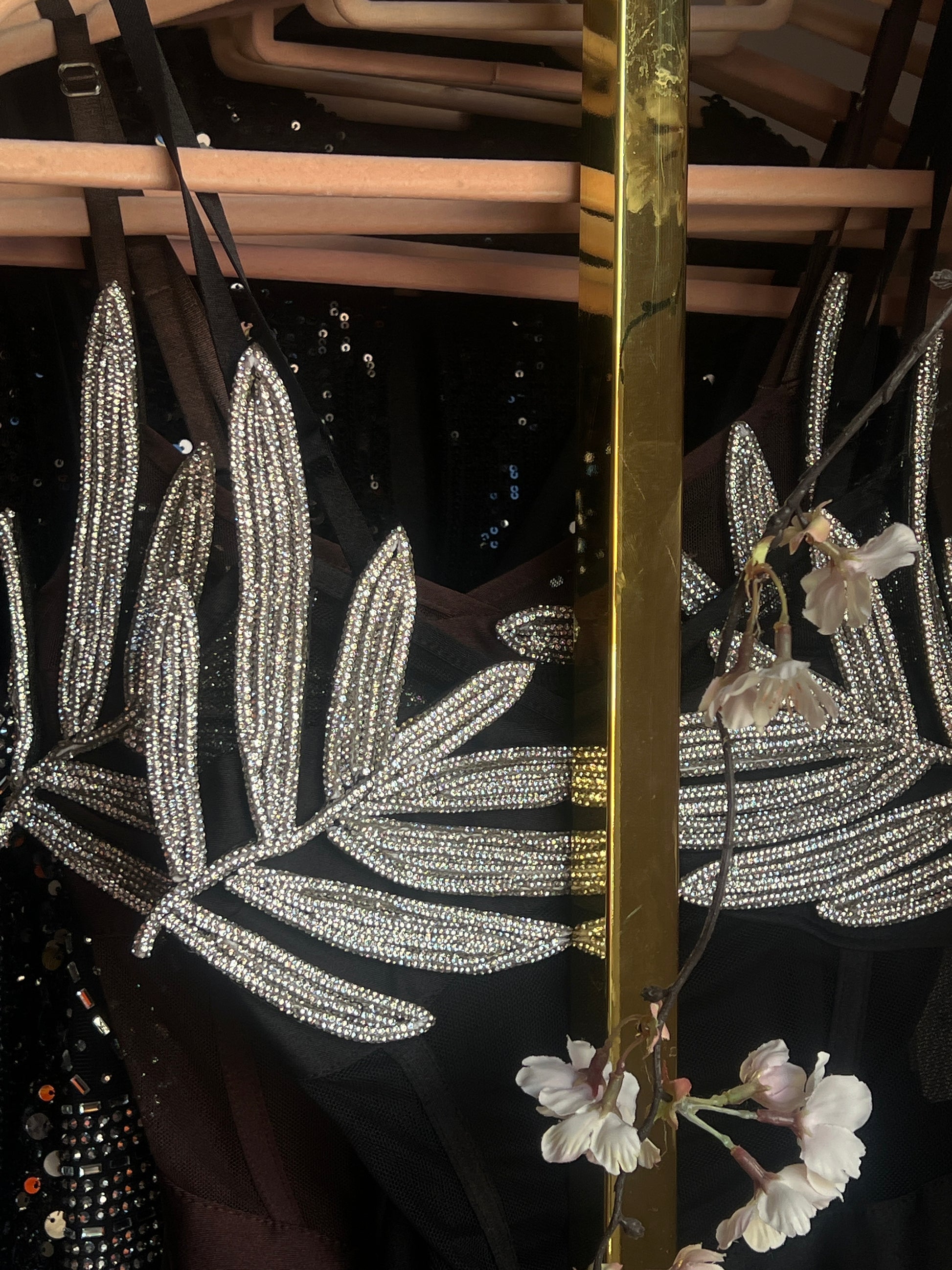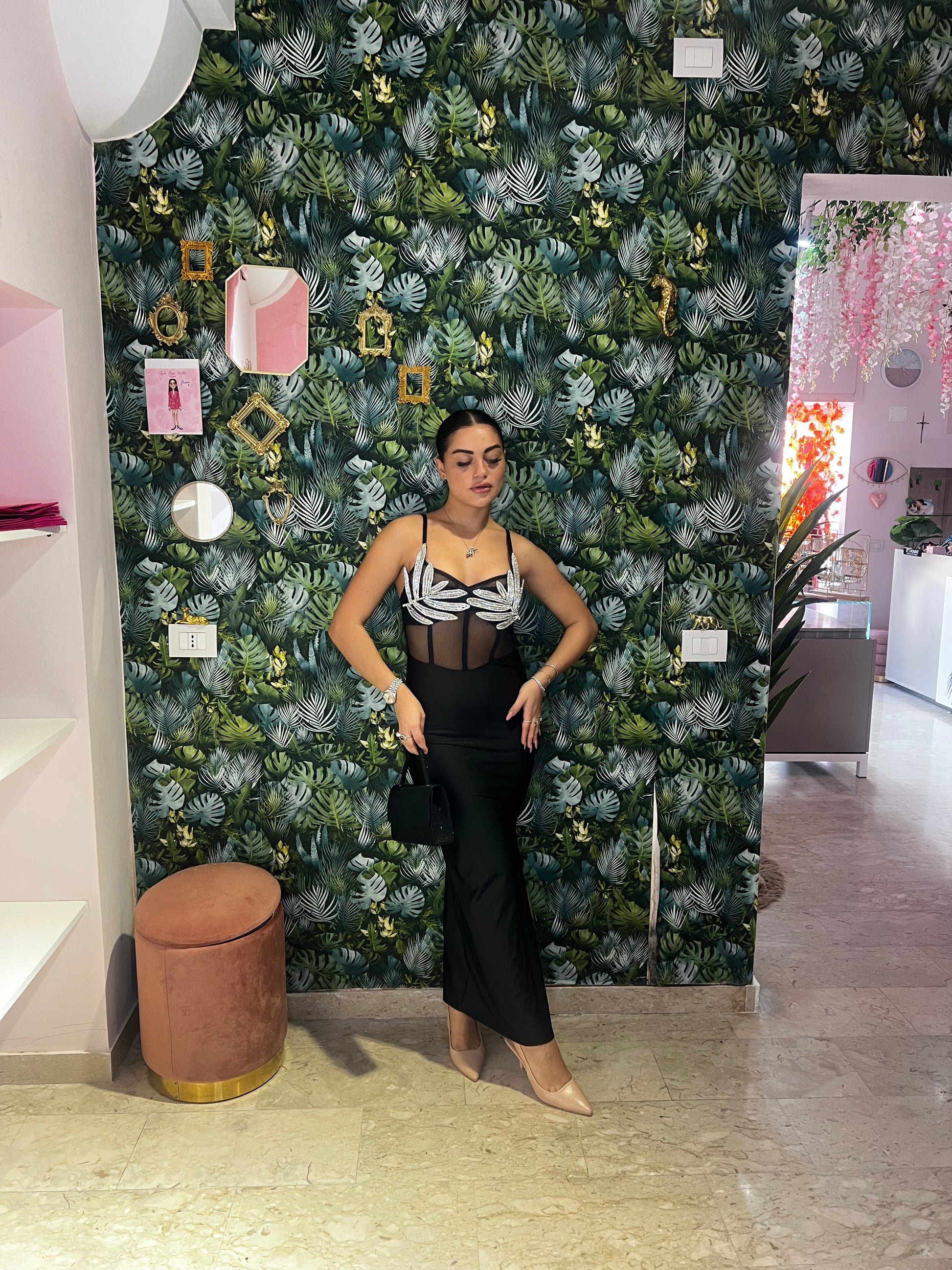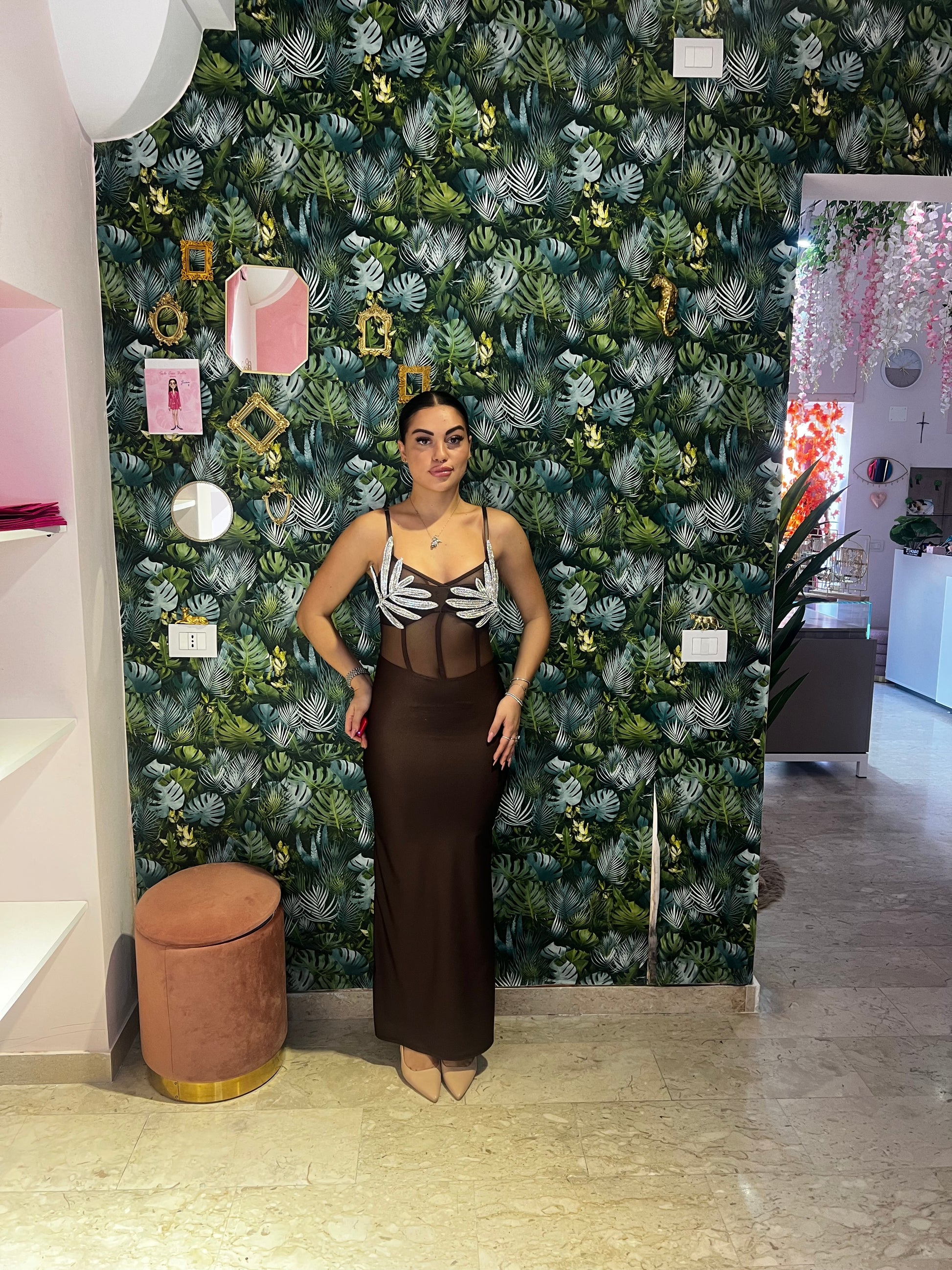 Questo abito a sirena da cerimonia è un'opera d'arte scintillante. Il corpino è decorato con foglie e strass, i dettagli trasparenti aggiungono eleganza e fascino. Affascinate tutti con la vostra grazia e glamour in questo abito unico.