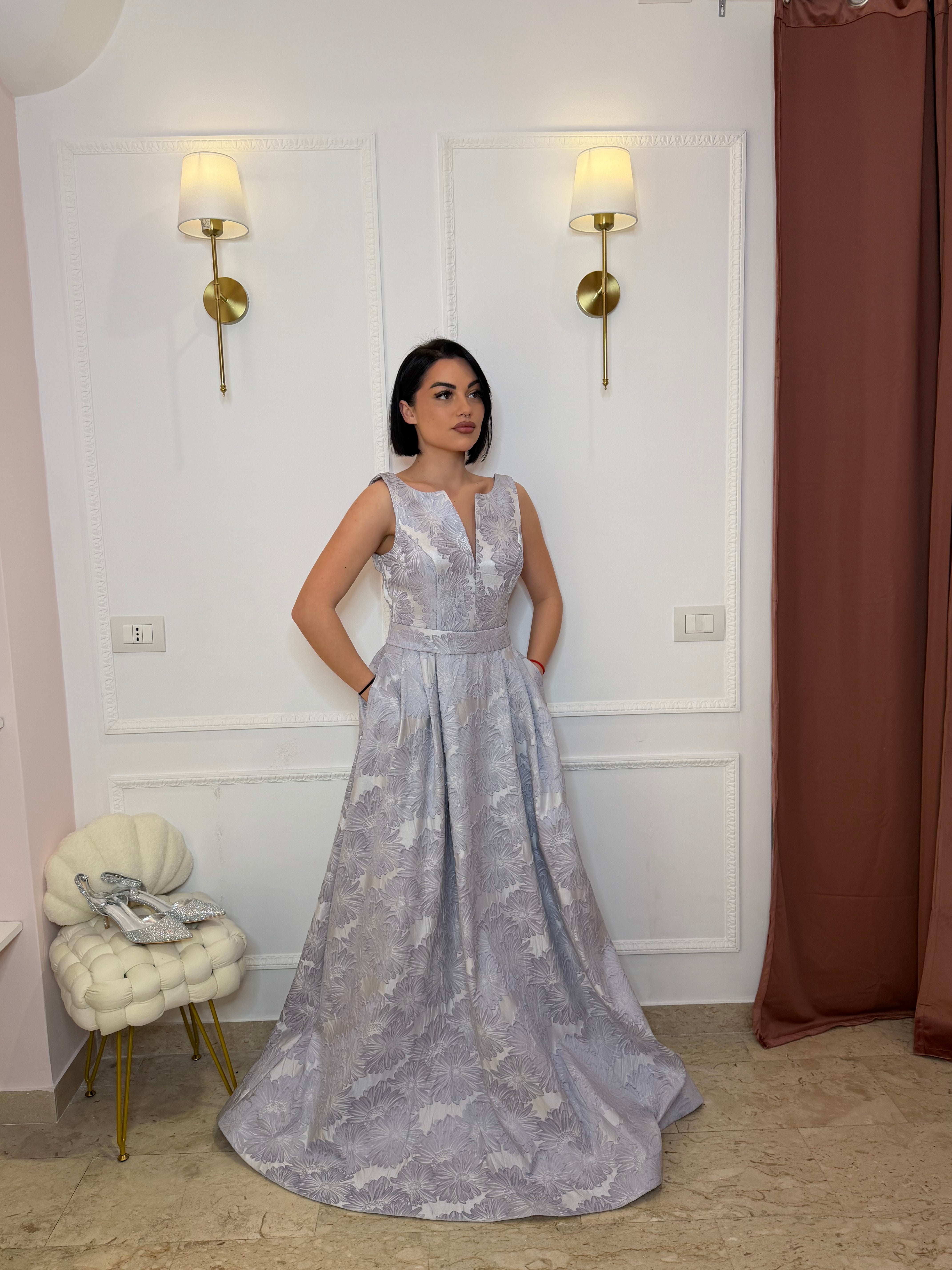L'abito Elenoir è progettato per occasioni formali e ruoli di rilievo, realizzato in un tessuto strutturato che garantisce una vestibilità ottimale. I fiori ricamati aggiungono un tocco di raffinatezza, rendendolo una scelta ideale per eventi che richiedono un'impronta di eleganza.