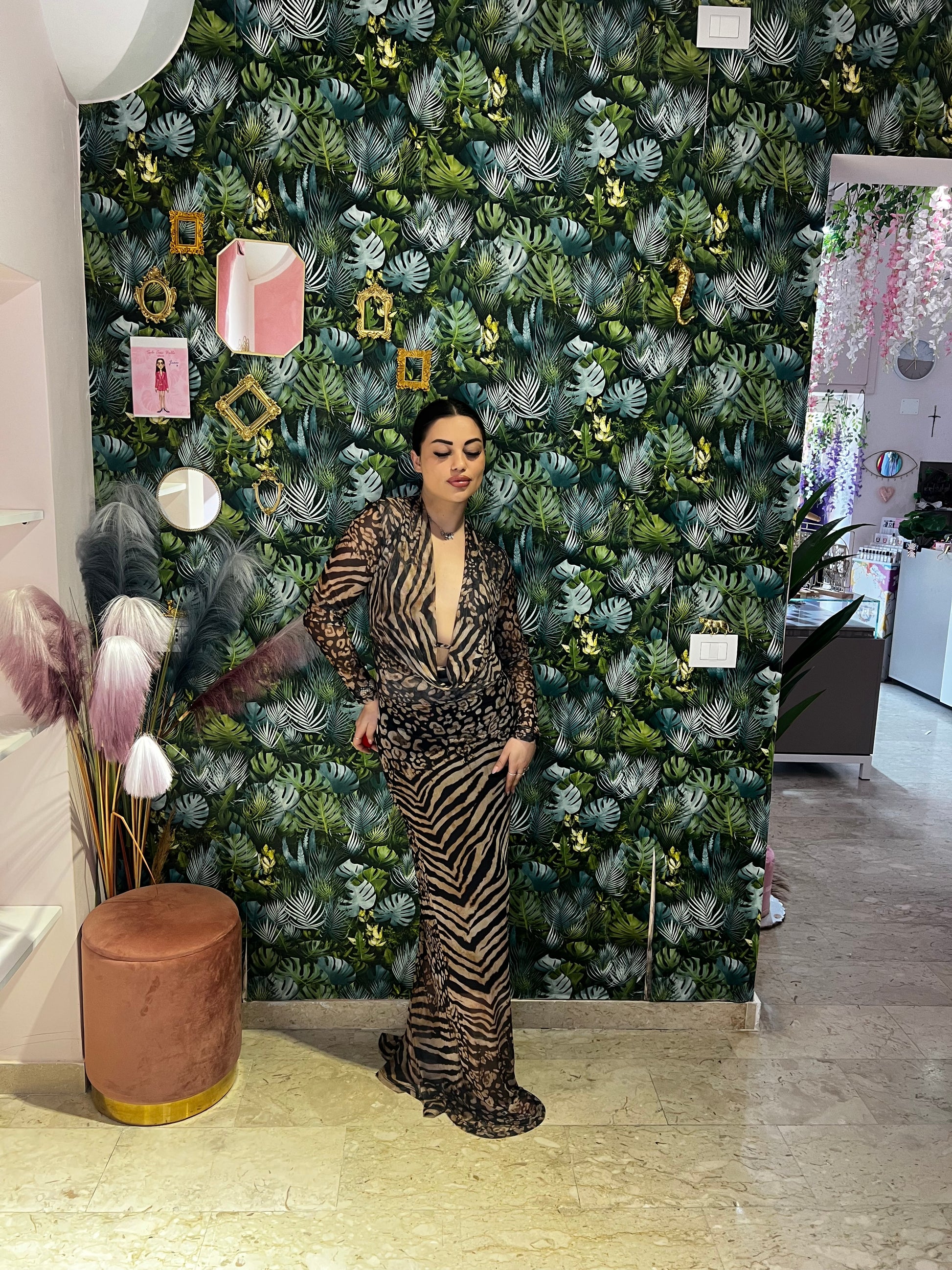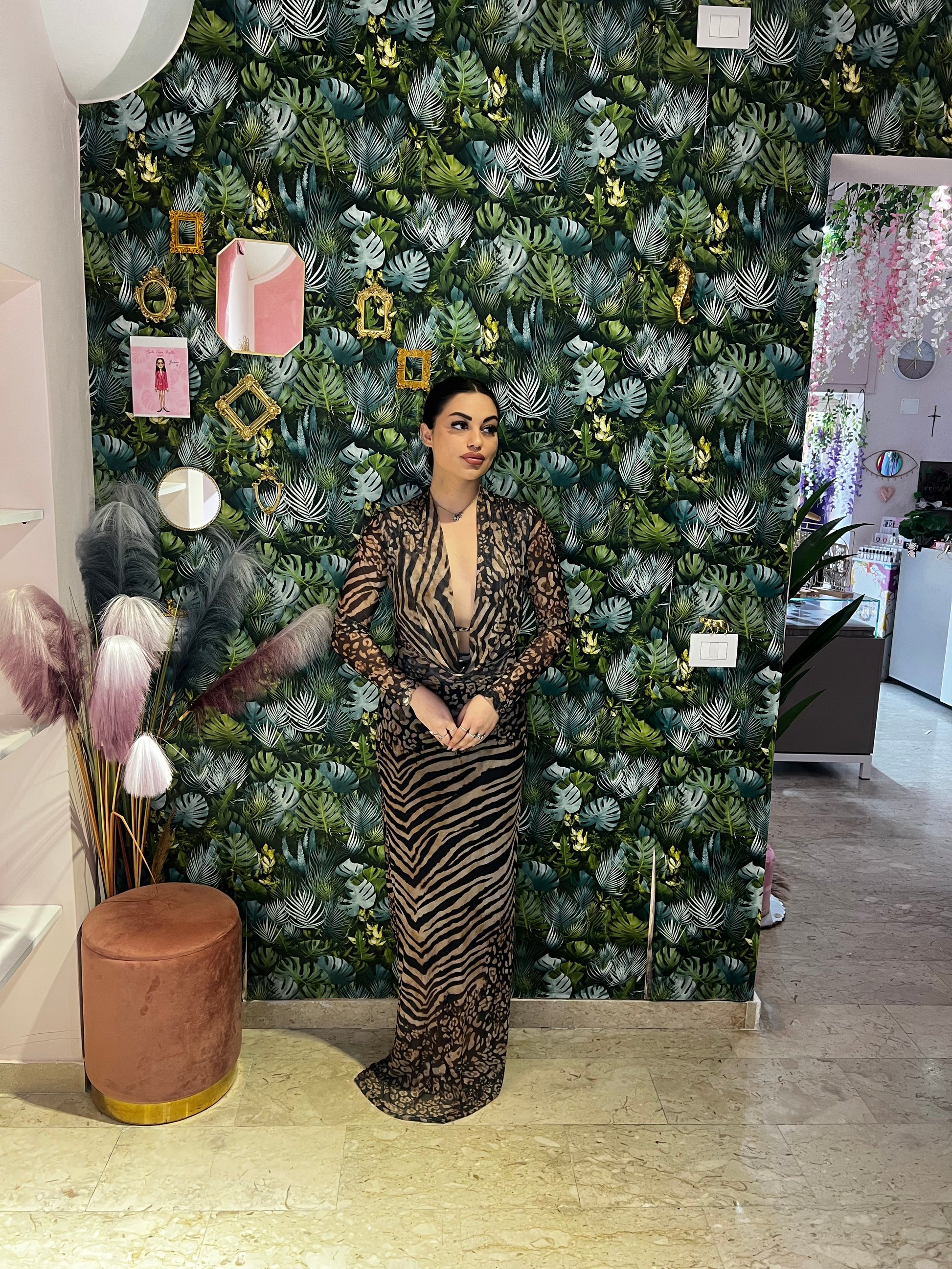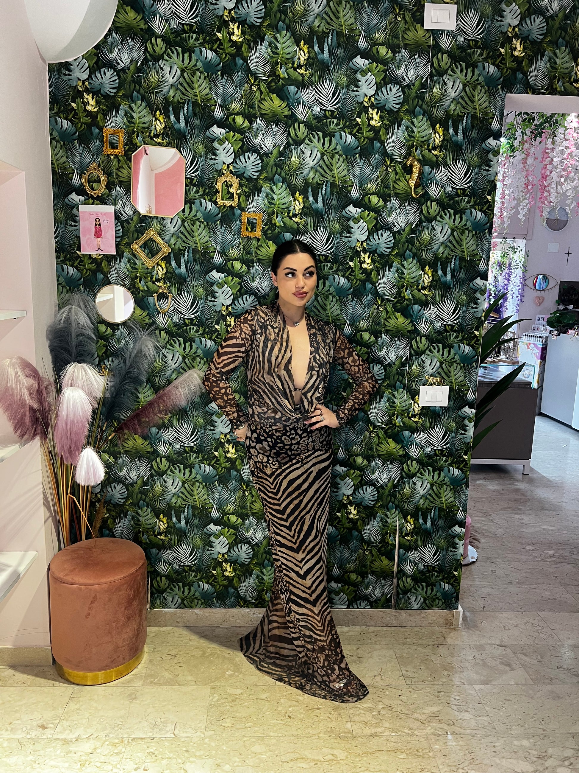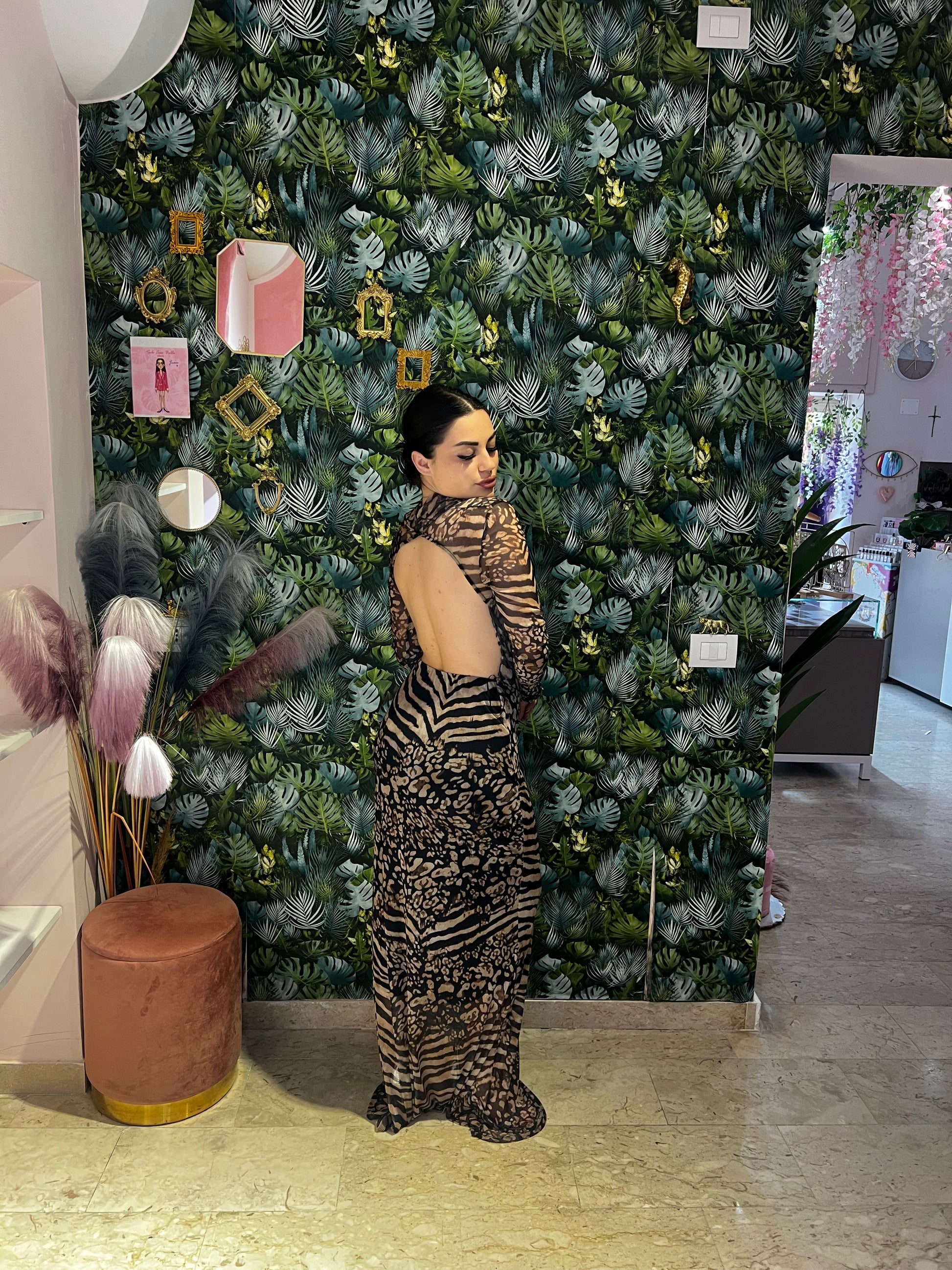 Celebra la tua femminilità con lo splendido Abito Jaguar Lumina. Con il suo effetto animalier, trasparenze sul corpetto e schiena nuda, questo abito ti farà sentire elegante e sicura. Il perfetto mix di sensualità e raffinatezza per ogni occasione.