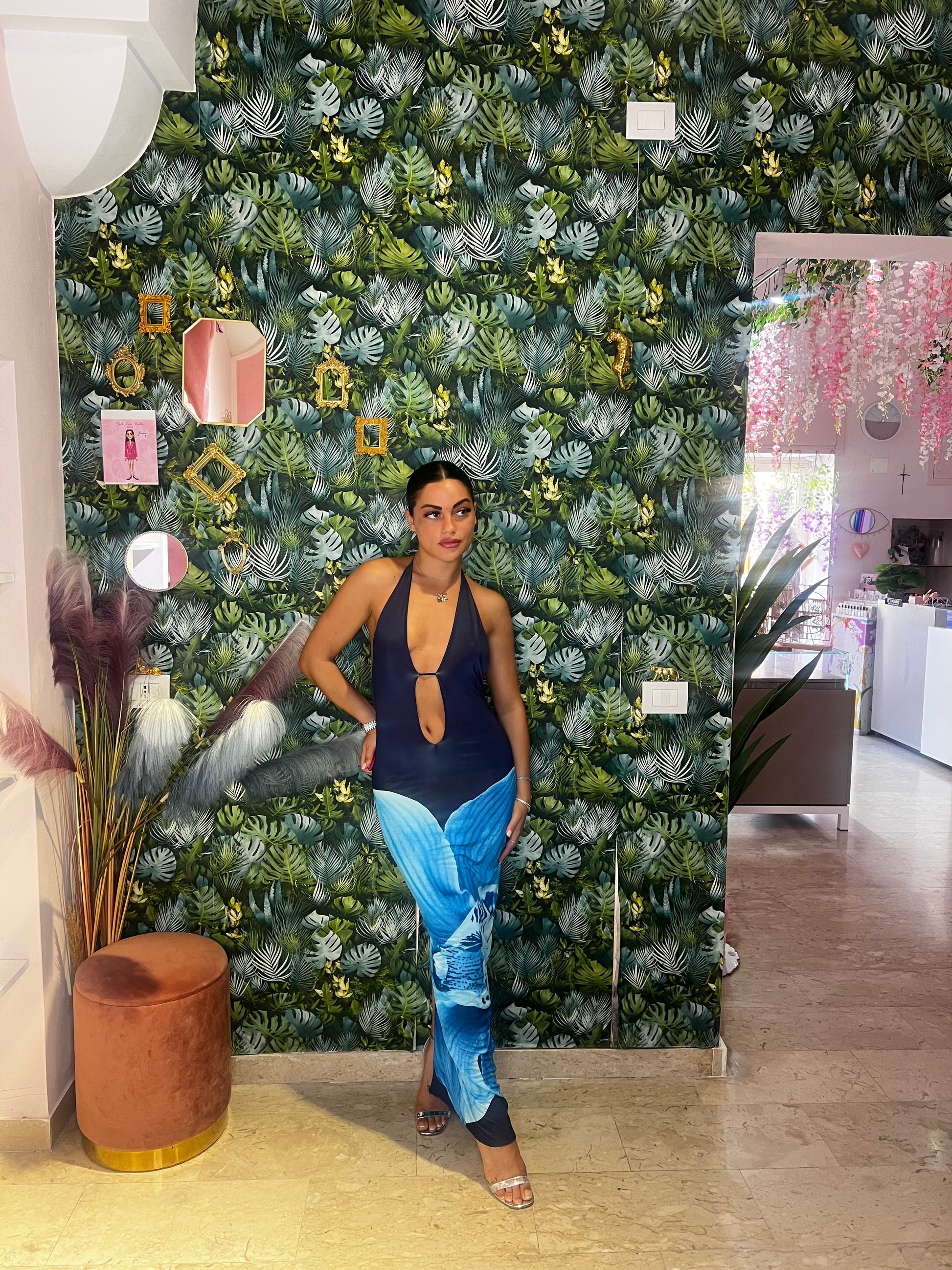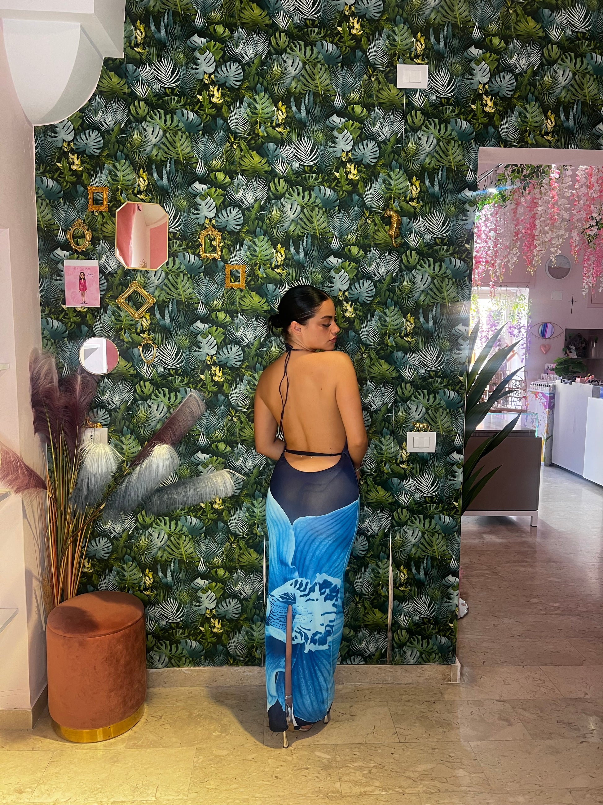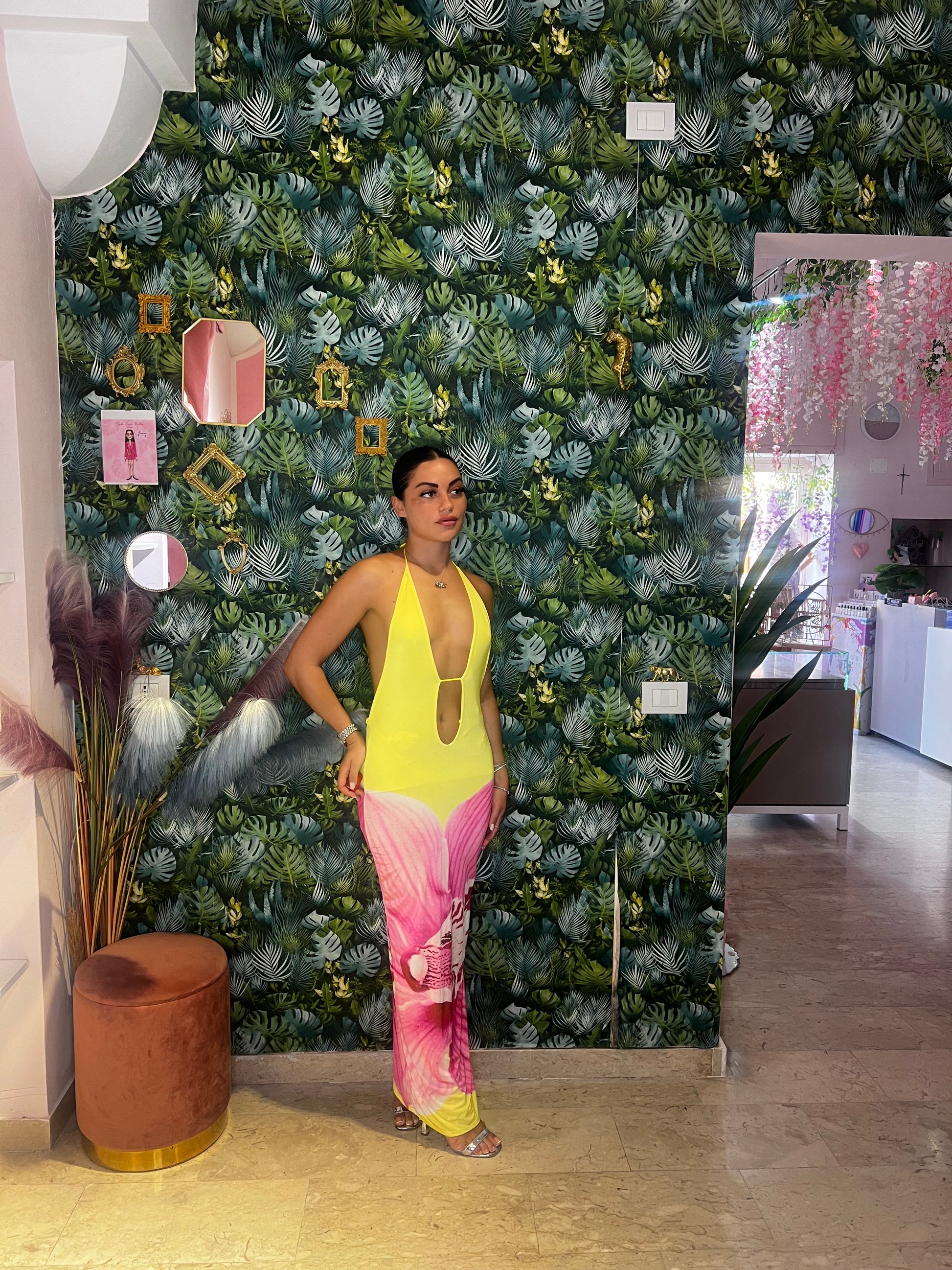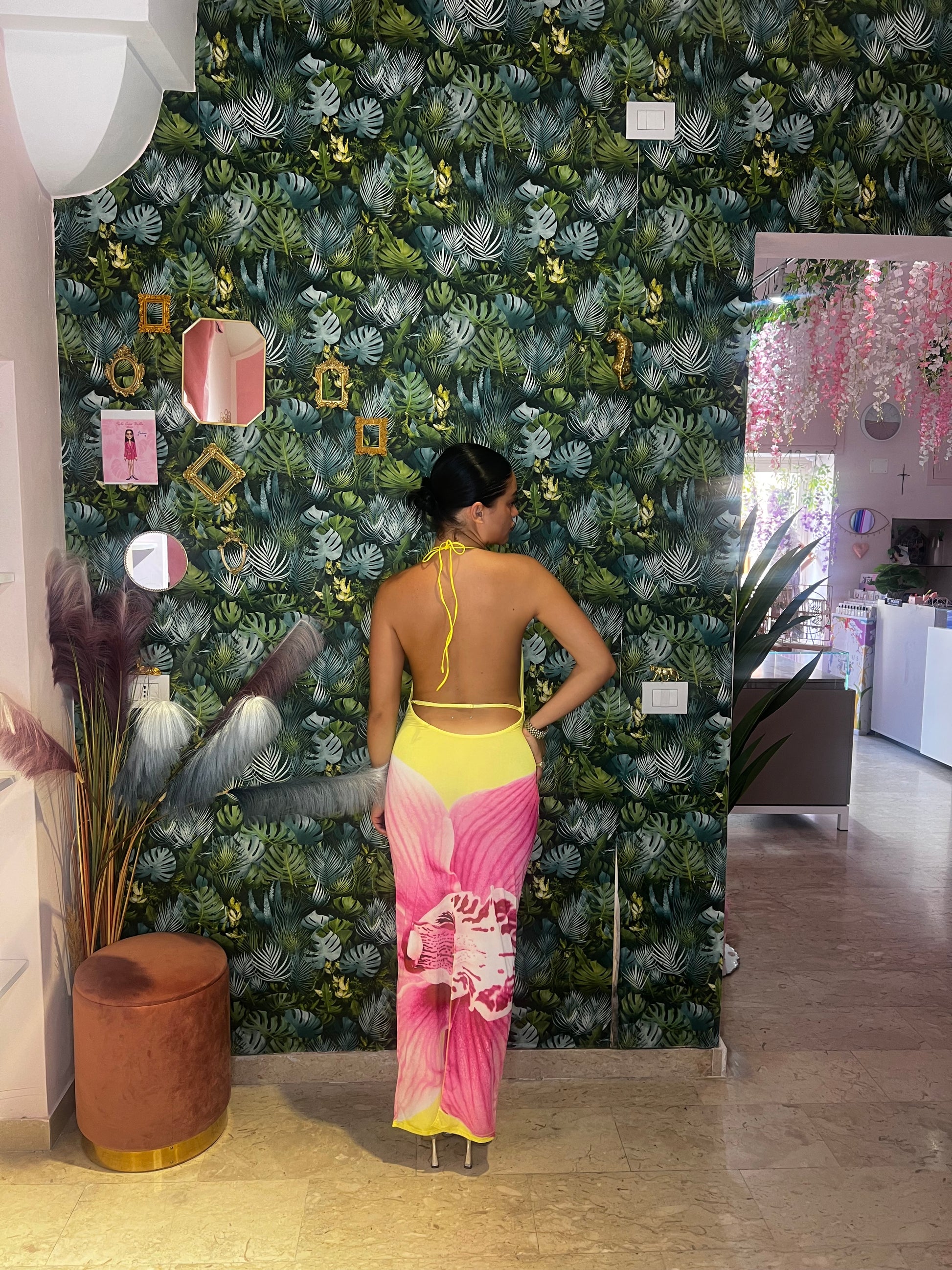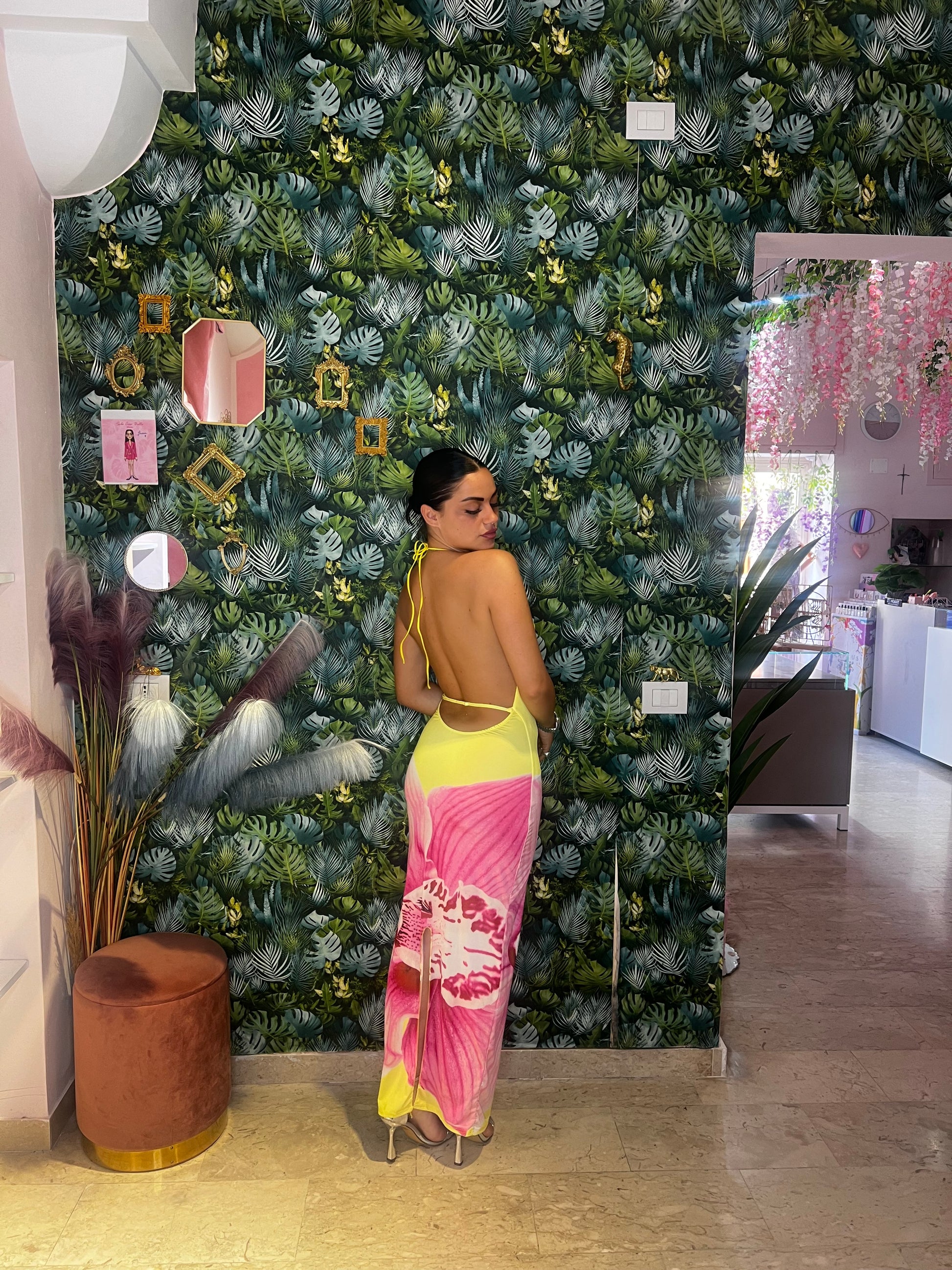 Questo abito elegante ti farà risaltare tra la folla grazie alla sua fantasia floreale e al suo design con dettagli cut out. La schiena scoperta aggiunge un tocco di sensualità e ti farà sentire sicura e sicura. Perfetto per occasioni speciali o serate fuori.