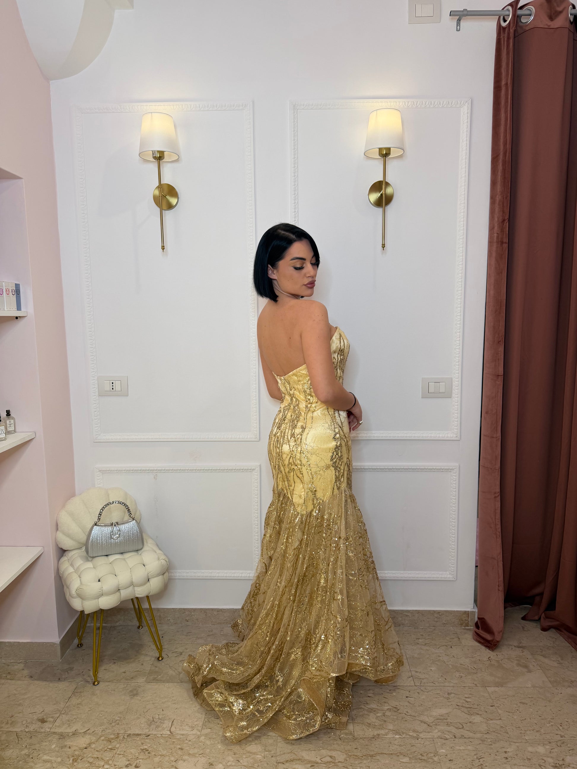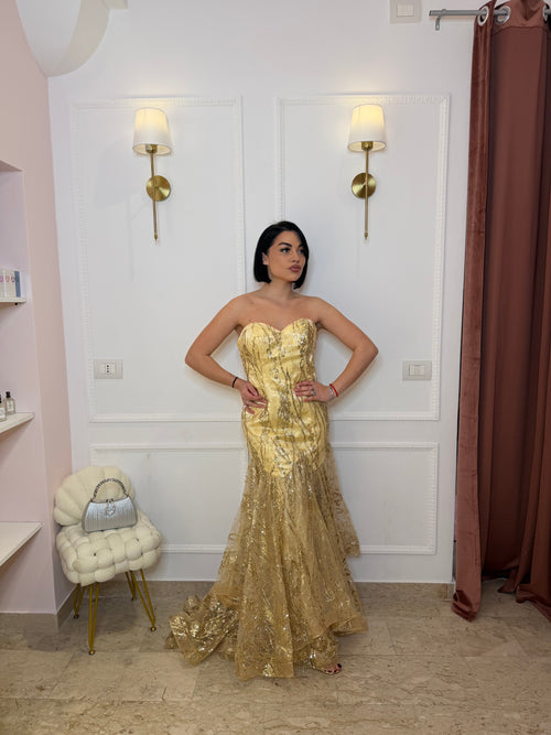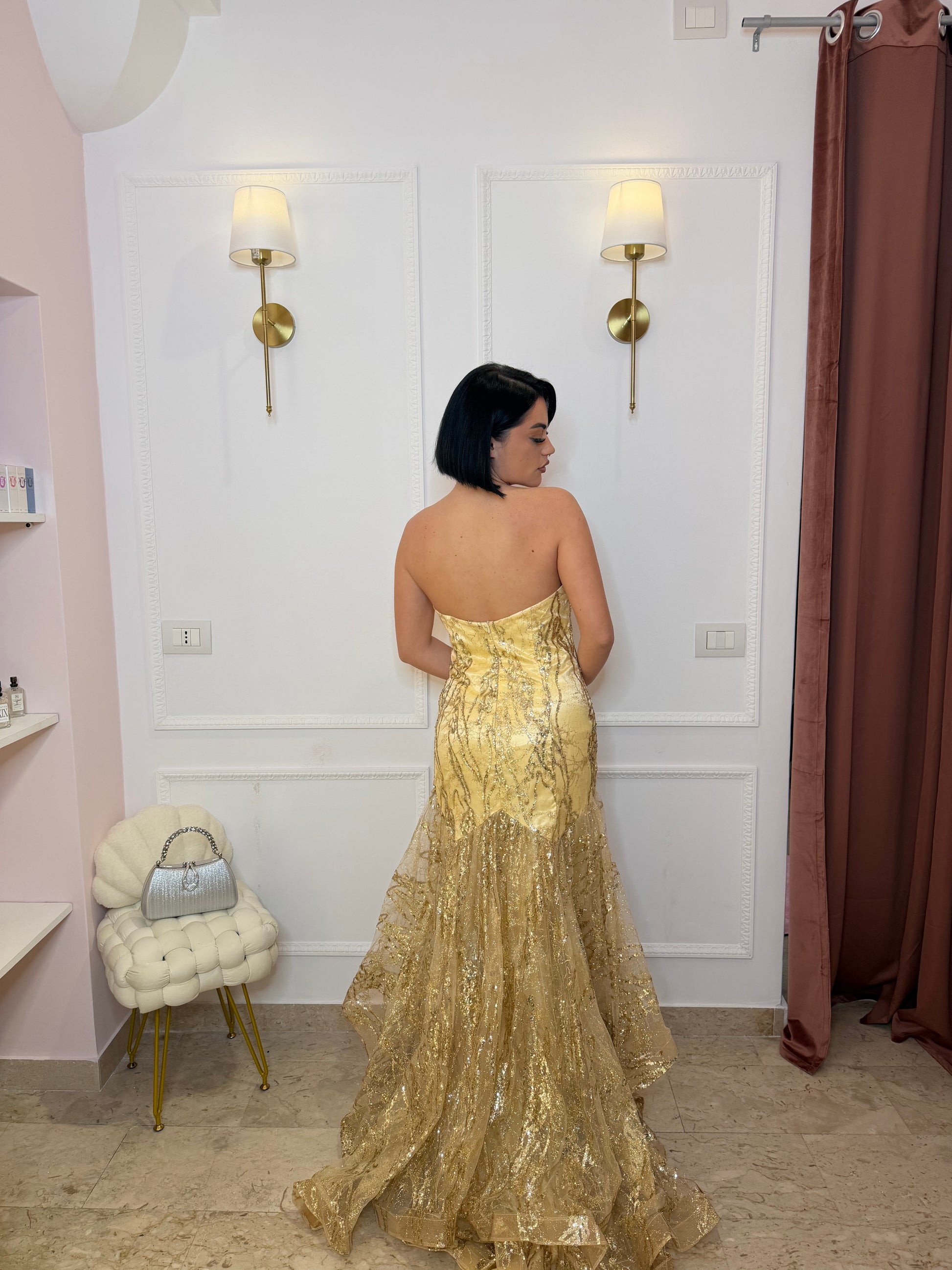 L'Abito Selena è un elegante vestito decorato con strass, progettato per offrire un aspetto sofisticato e raffinato. La coda dona un tocco di classe, rendendolo ideale per eventi formali. La sua composizione di alta qualità assicura comfort e vestibilità ottimali, perfetta per il tuo prossimo incontro glamour.
