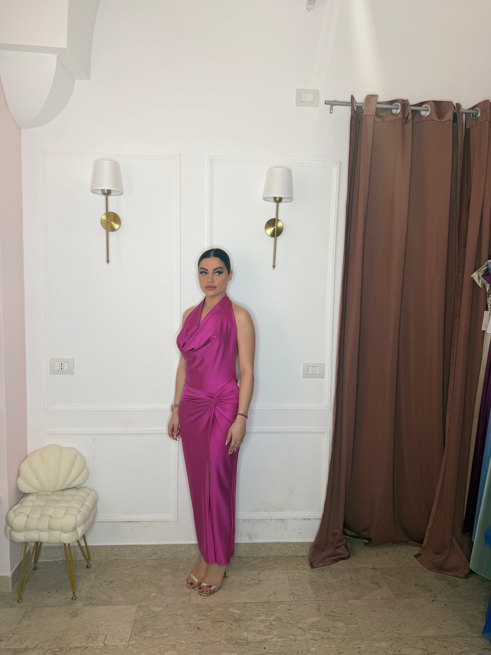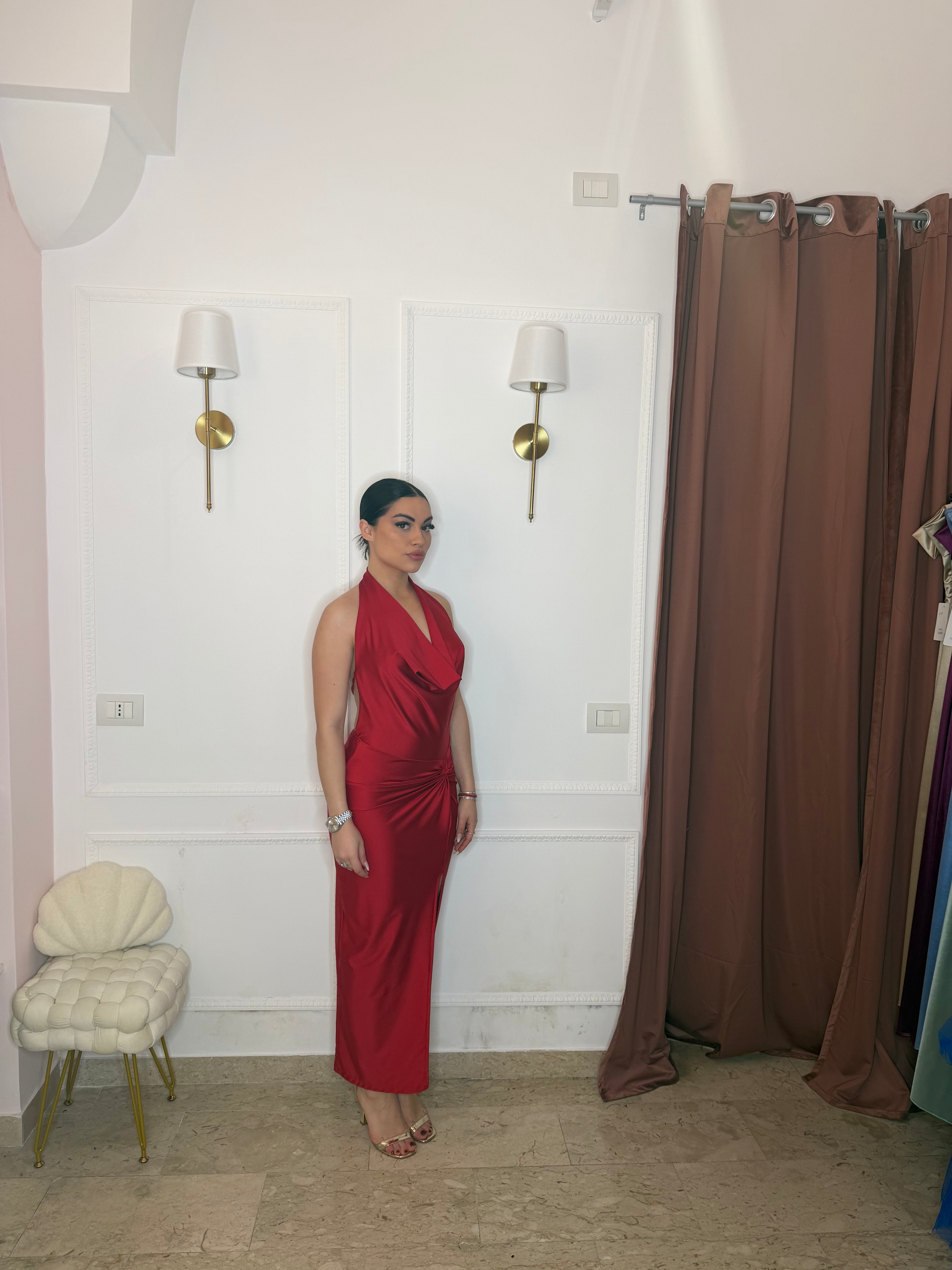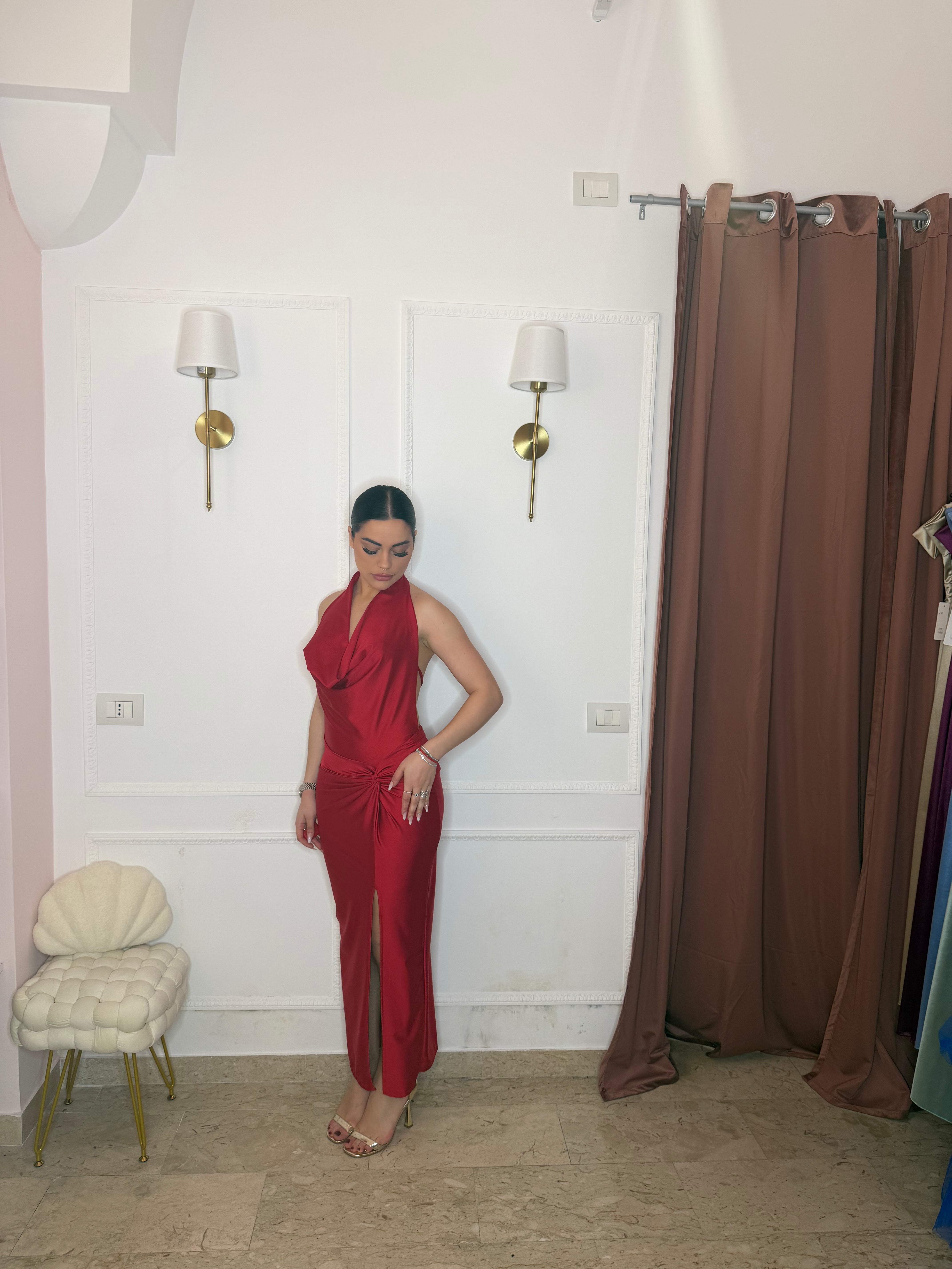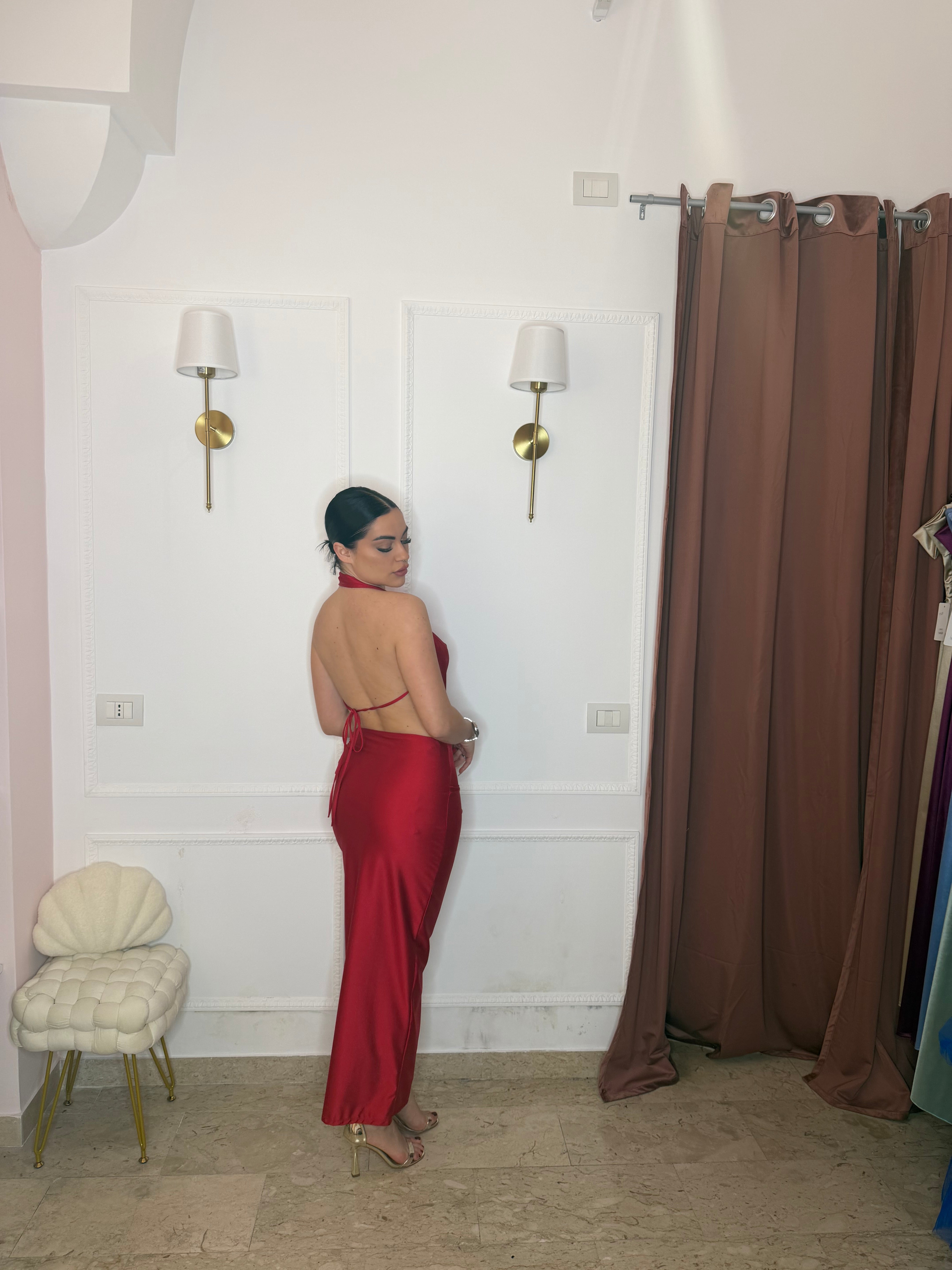 L'Abito Taylor è un abito da cerimonia, caratterizzato da una silhouette aderente, schiena scoperta e scollatura frontale. La sua progettazione specifica favorisce una vestibilità elegante, ottimizzando la silhouette del corpo. Questo design non solo esalta le linee del corpo, ma offre anche comfort e libertà di movimento.
