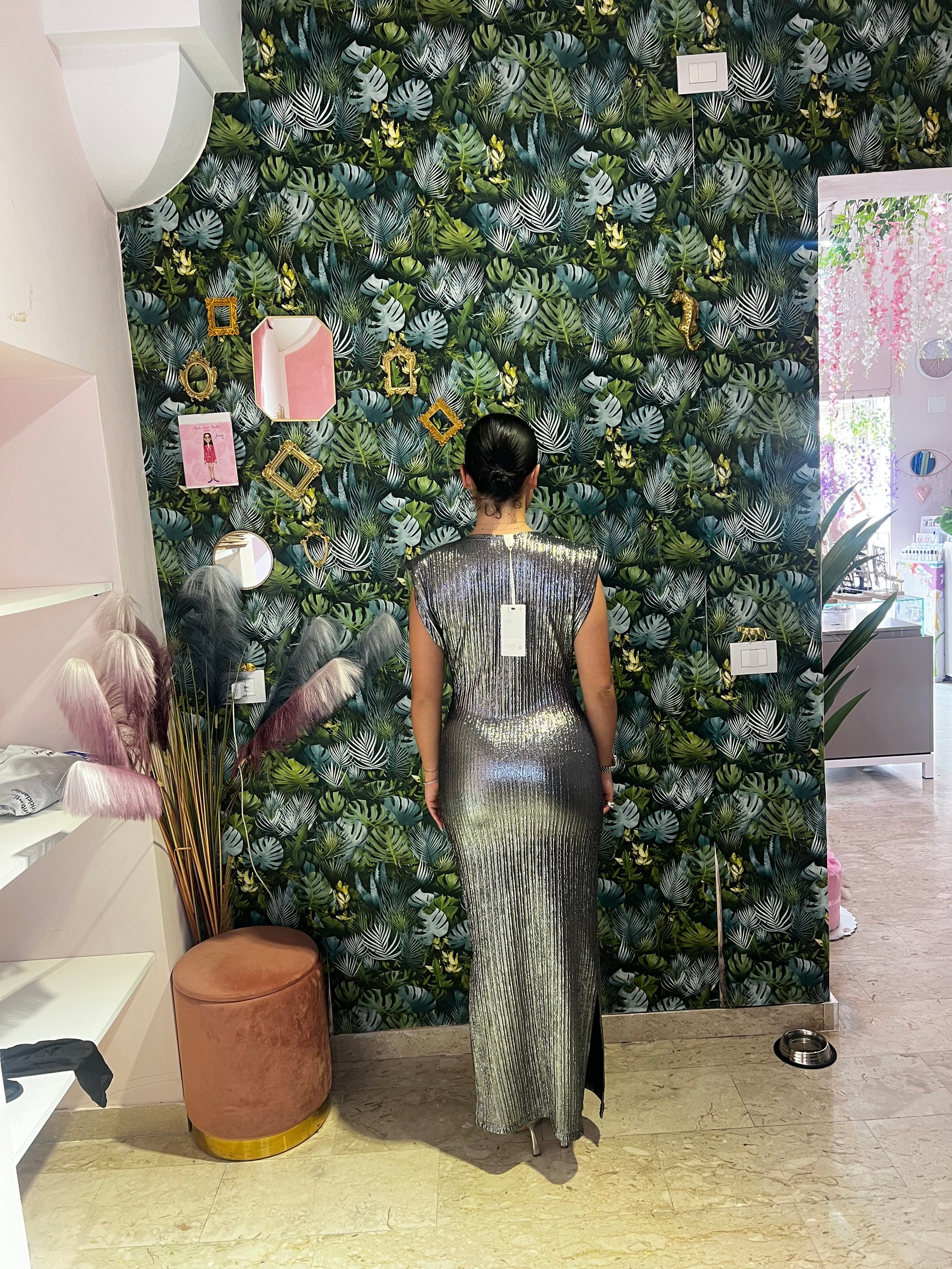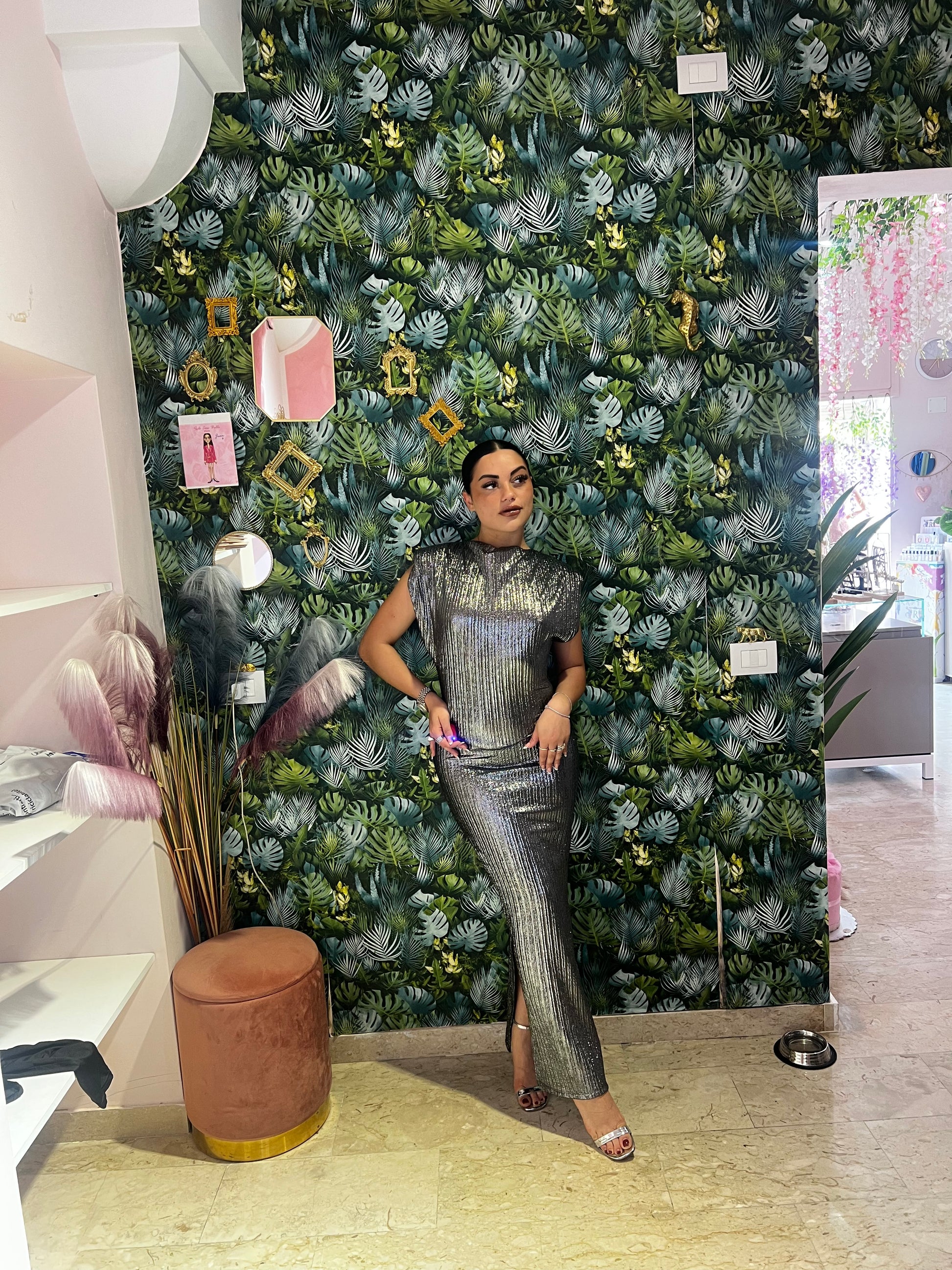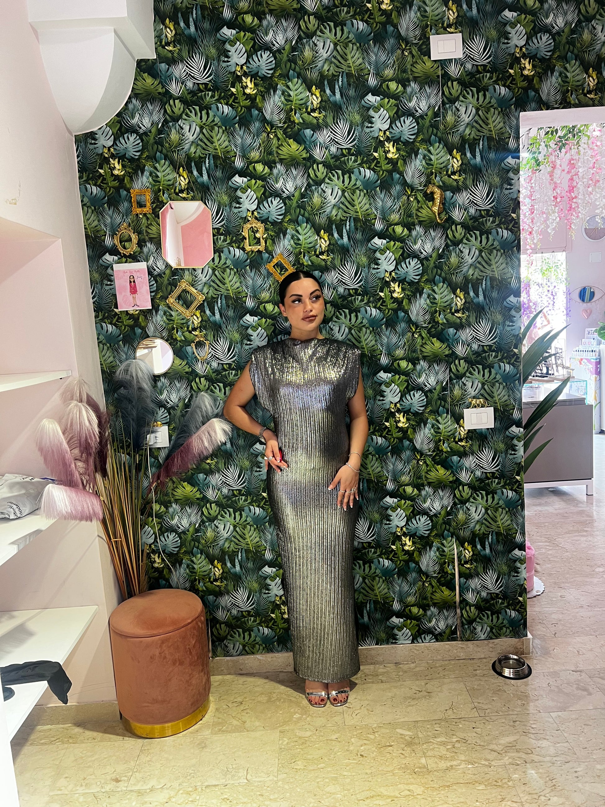 L'abito Urano è l'elegante scelta per una cerimonia. Il suo design aderente e l'effetto laminato conferiscono un tocco di lusso e originalità al tuo outfit. Perfetto per farti risplendere e sentirsi sicura di te.