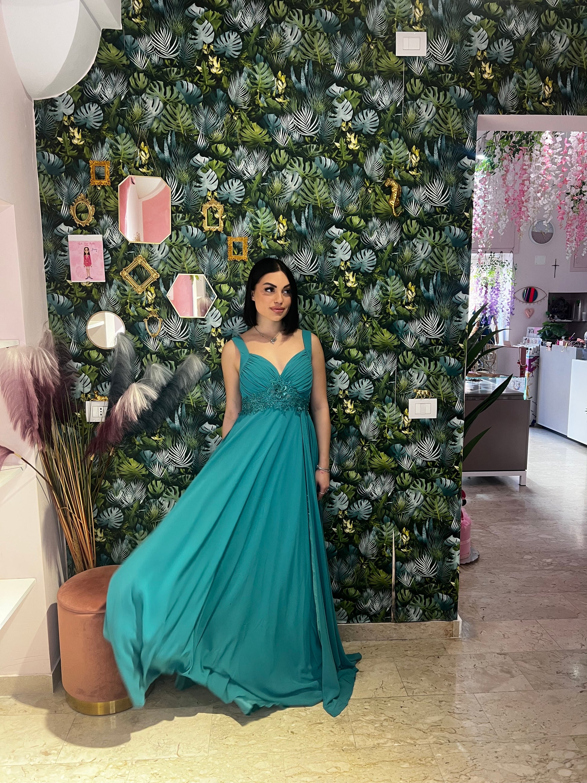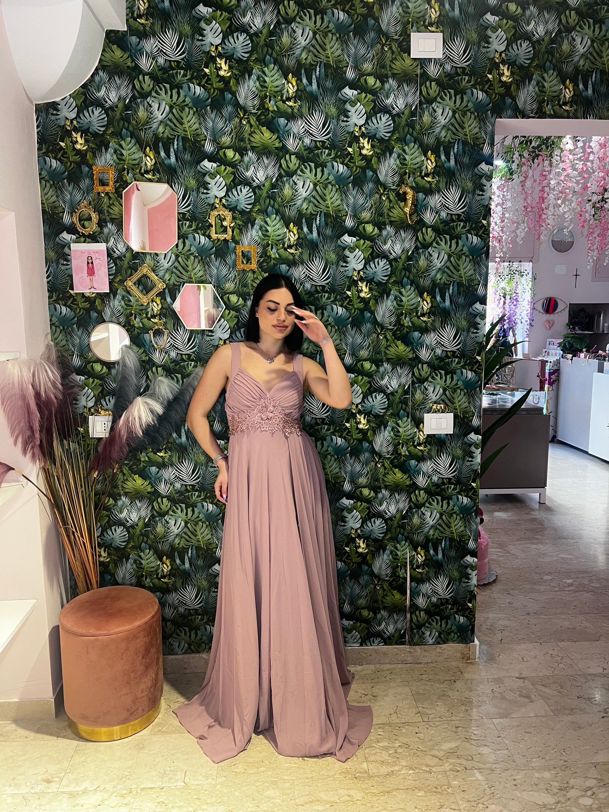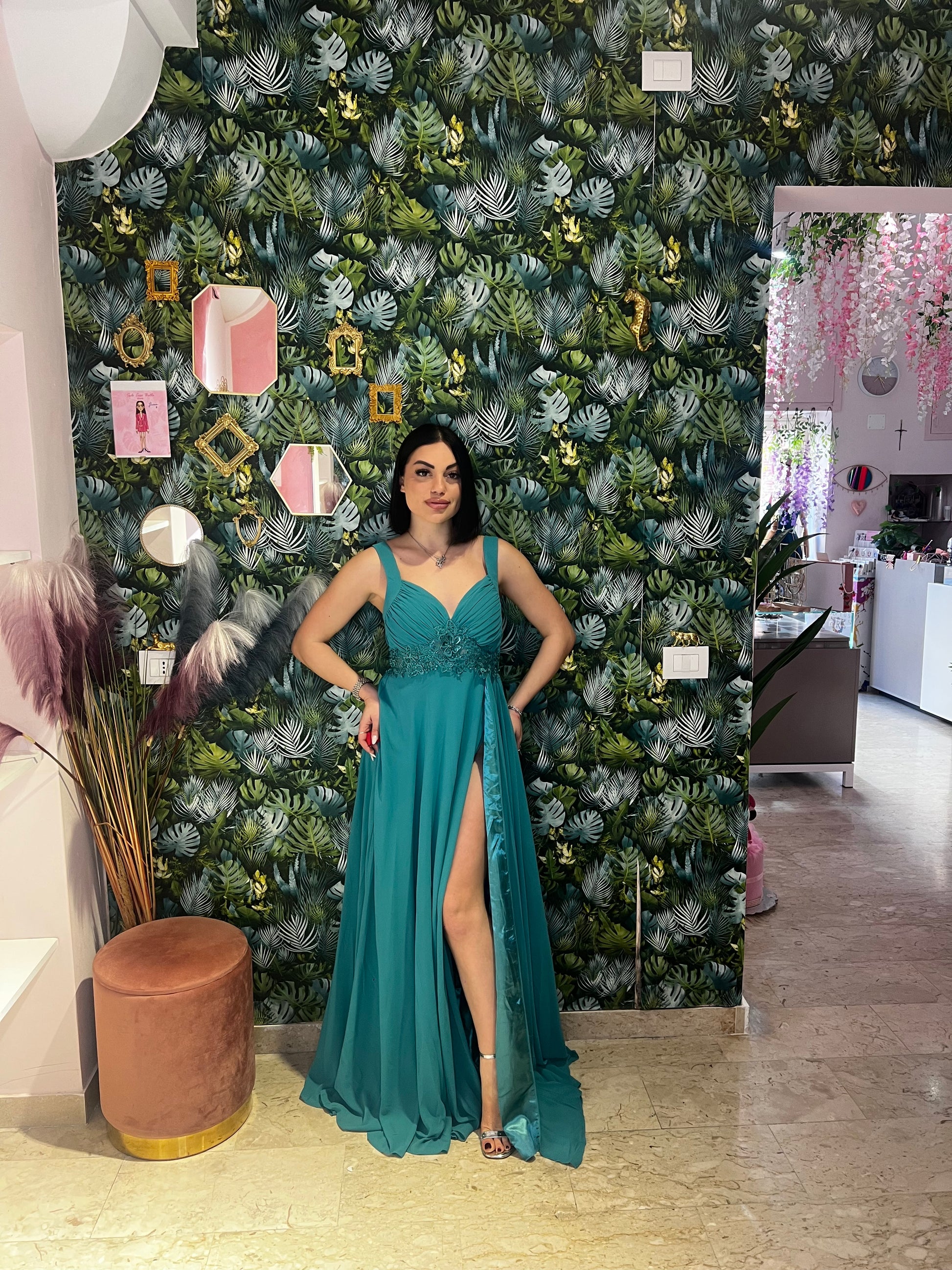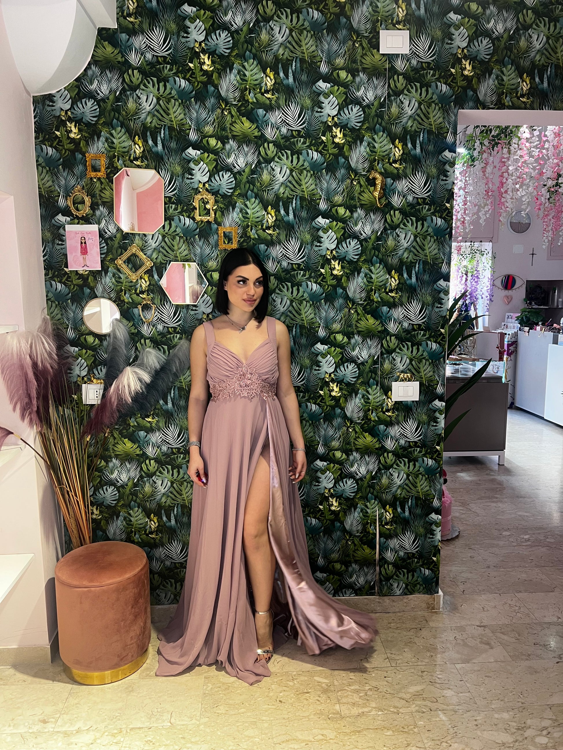 Esplora il tuo stile con l'Abito Ylenia Luxury! Questo elegante abito da cerimonia presenta un'ampia gonna morbida e uno spacco per un look sofisticato. Il corpetto elaborato e l'elastico sul retro ti assicurano una vestibilità perfetta. Ideale anche per testimoni.