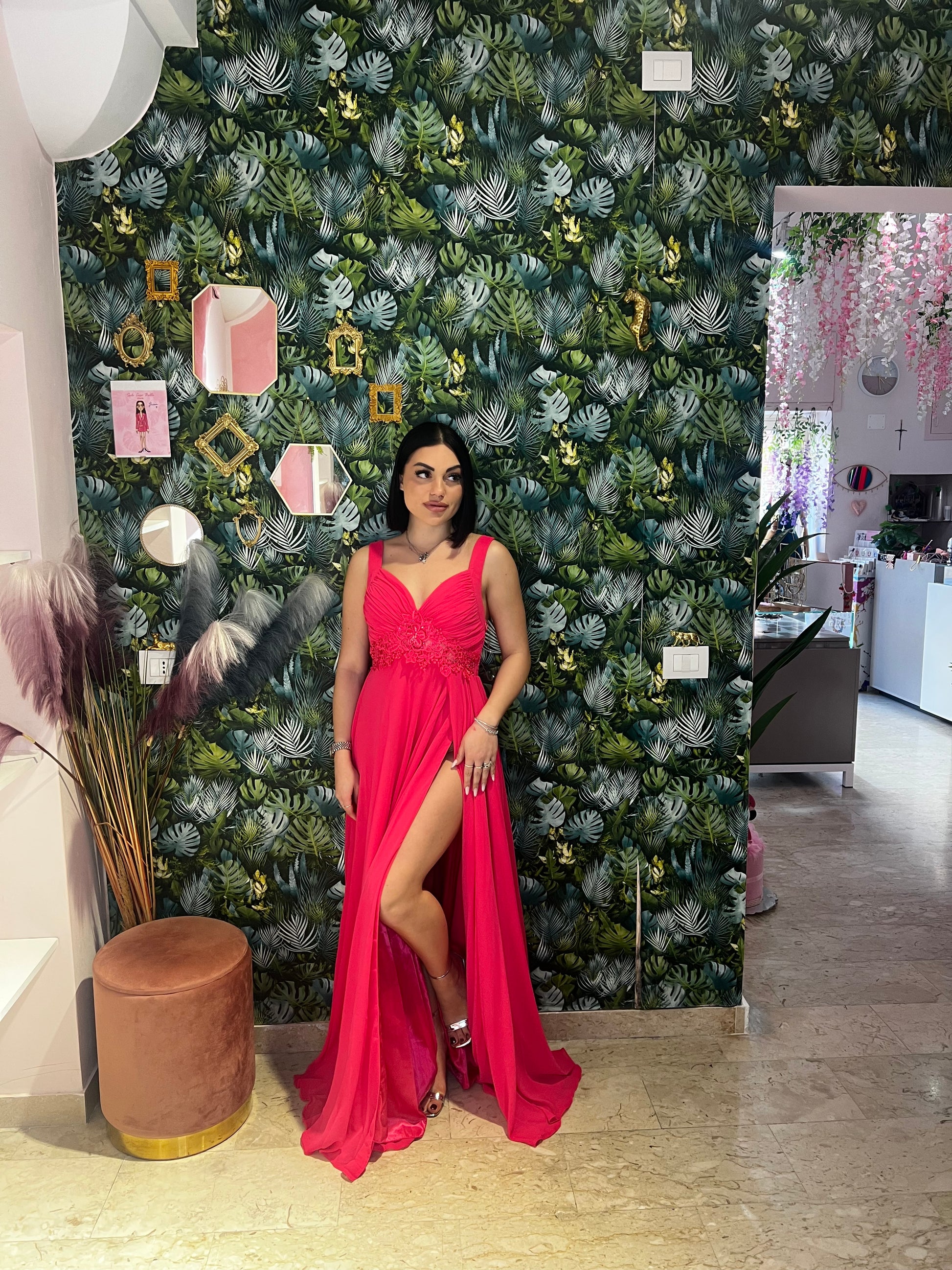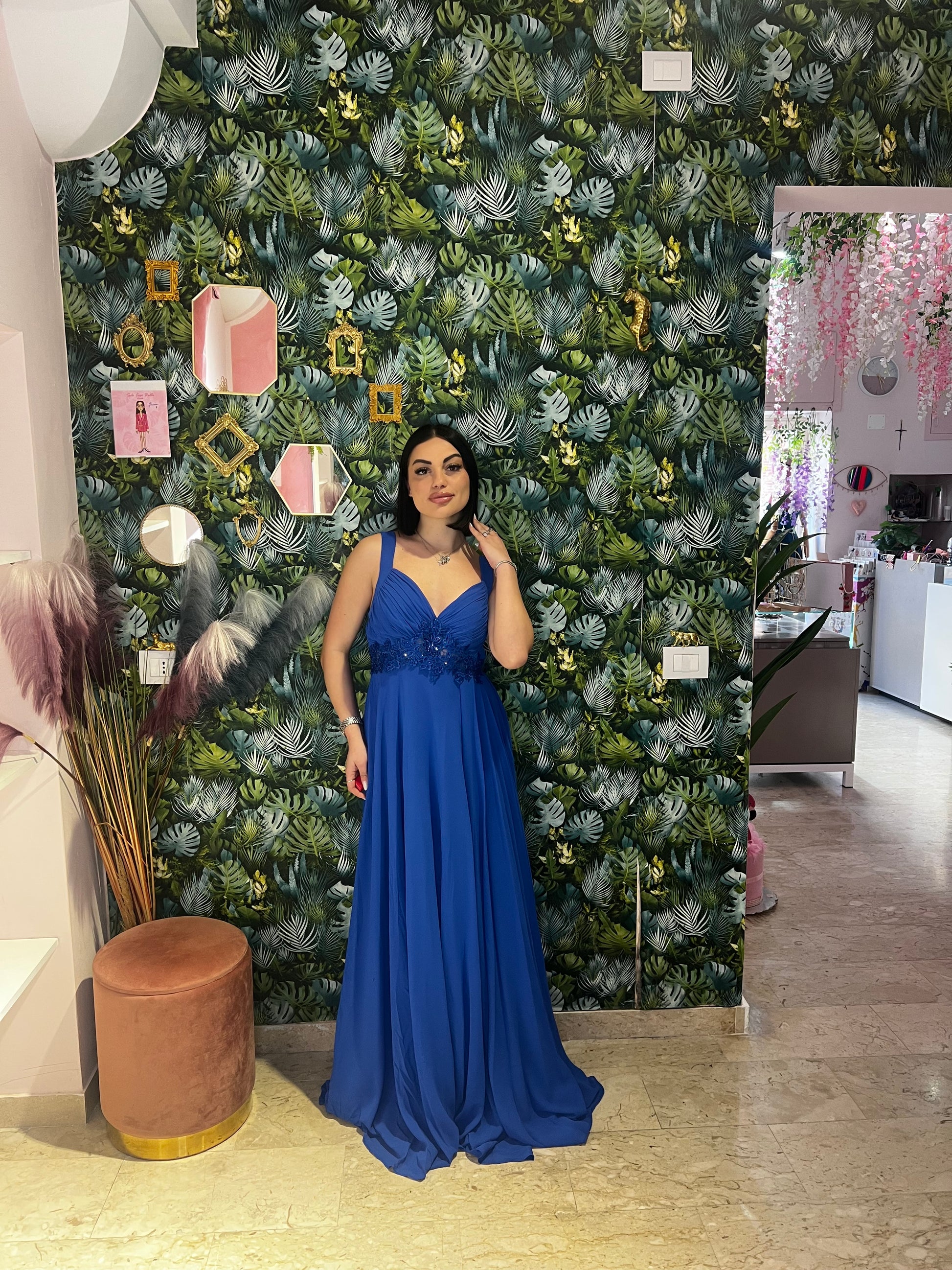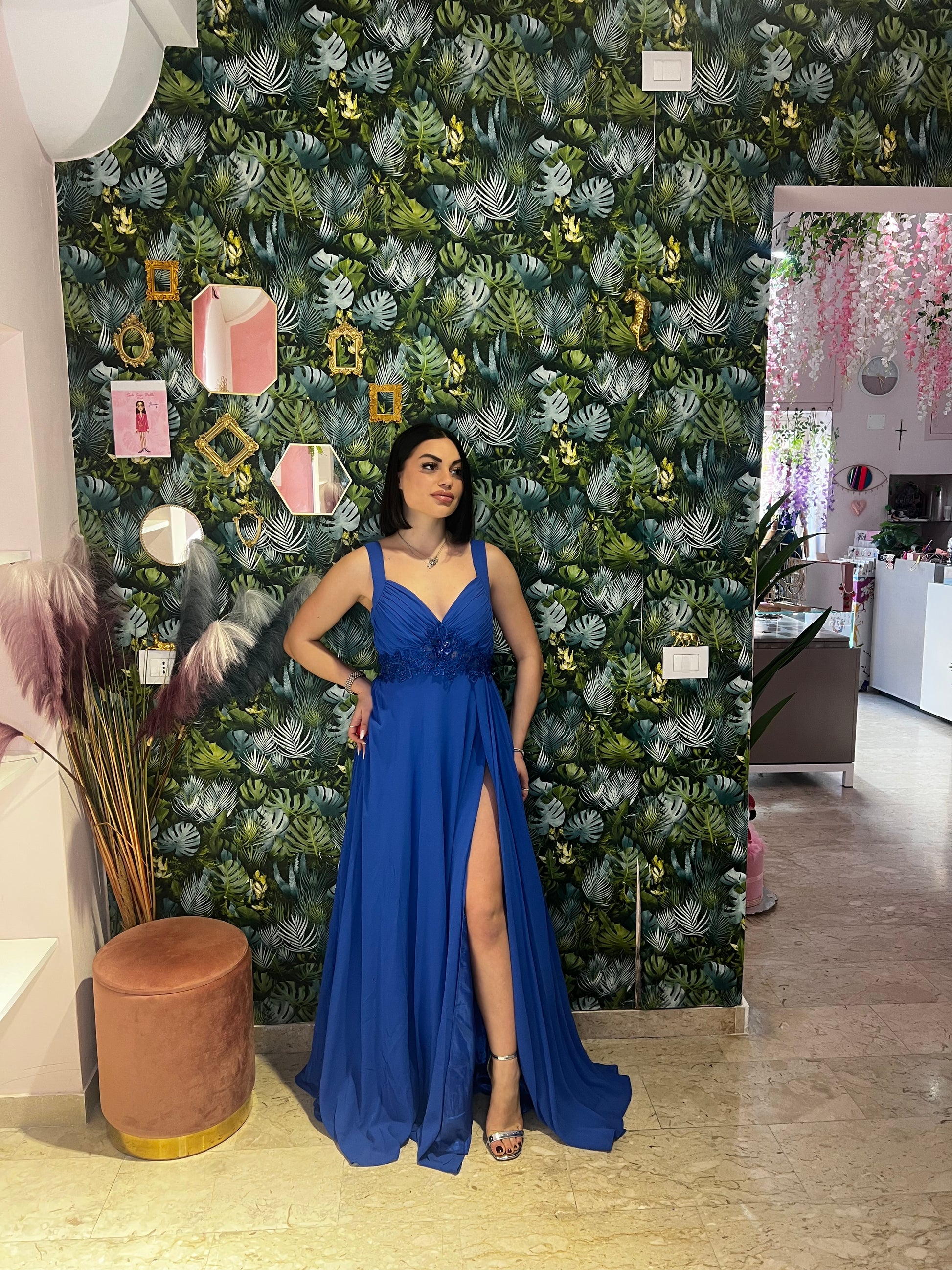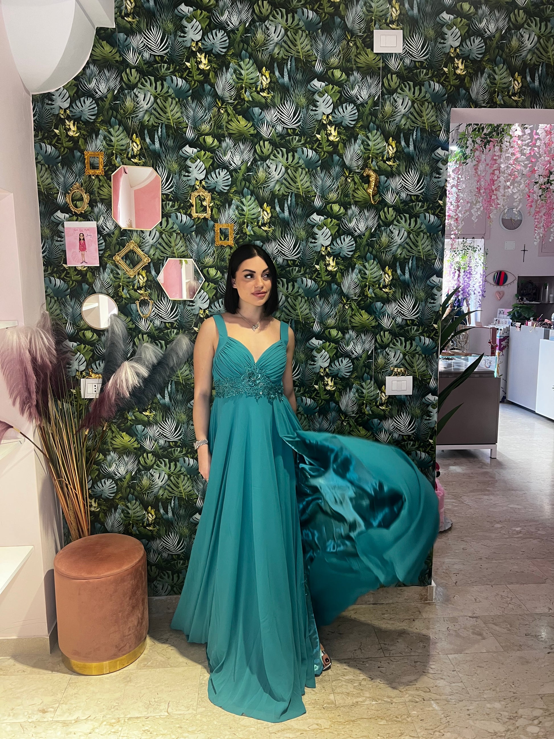 Esplora il tuo stile con l'Abito Ylenia Luxury! Questo elegante abito da cerimonia presenta un'ampia gonna morbida e uno spacco per un look sofisticato. Il corpetto elaborato e l'elastico sul retro ti assicurano una vestibilità perfetta. Ideale anche per testimoni.