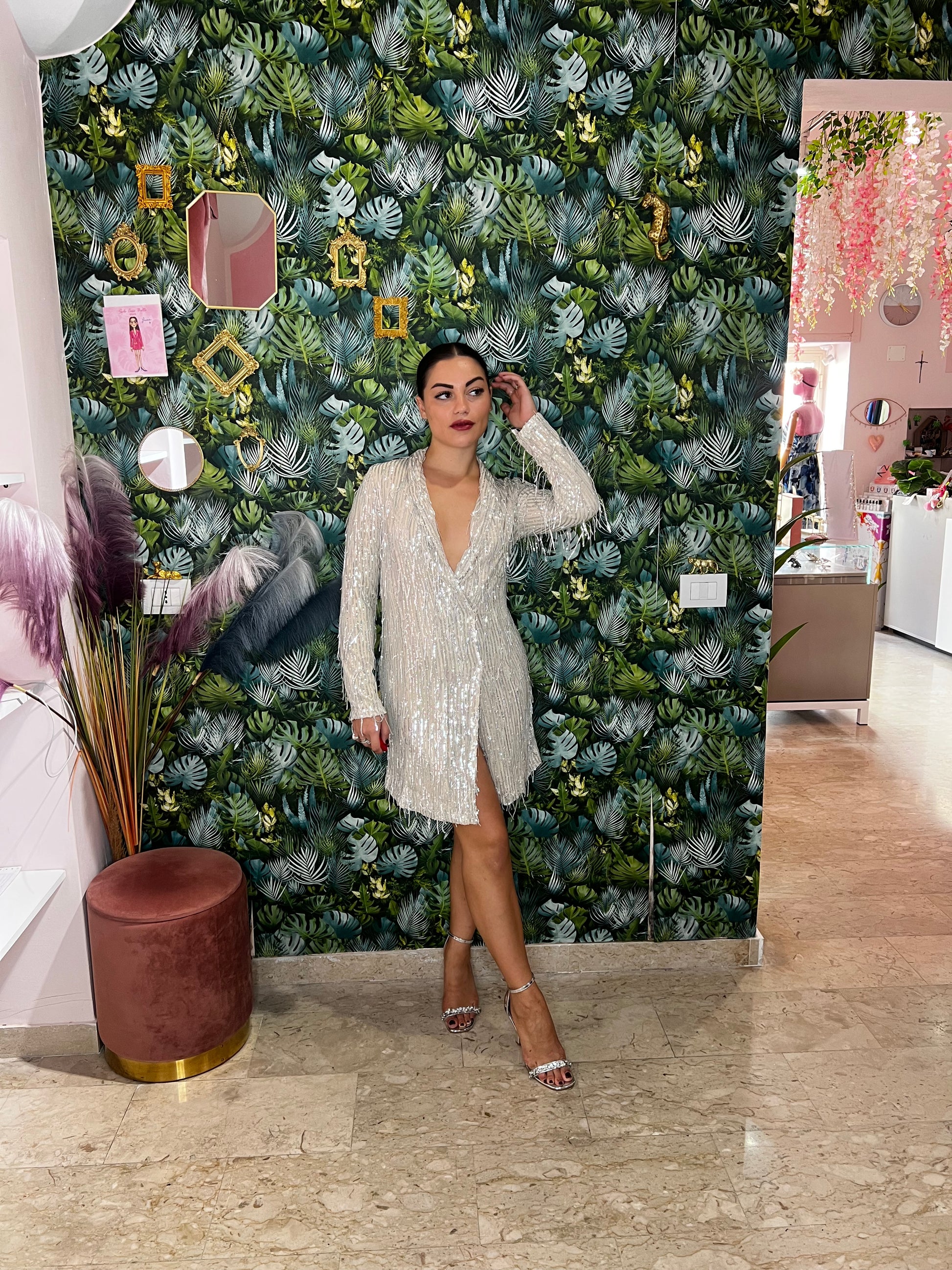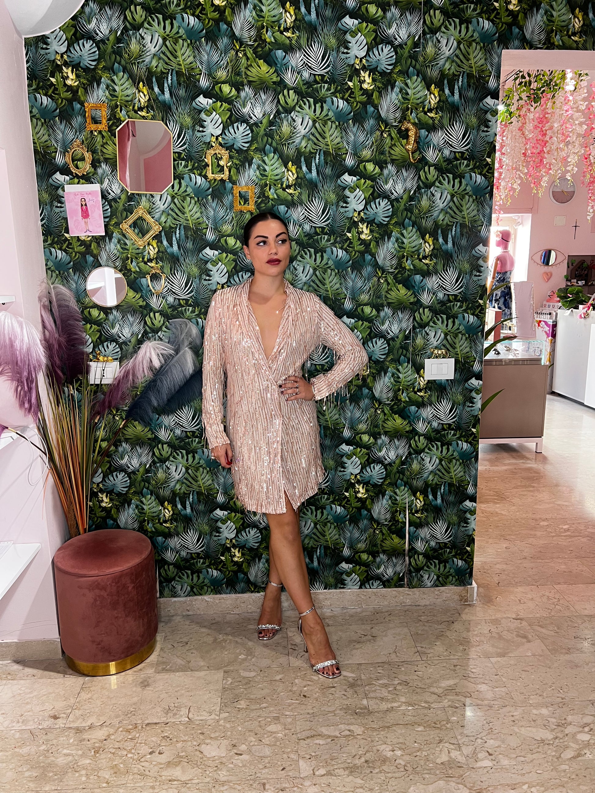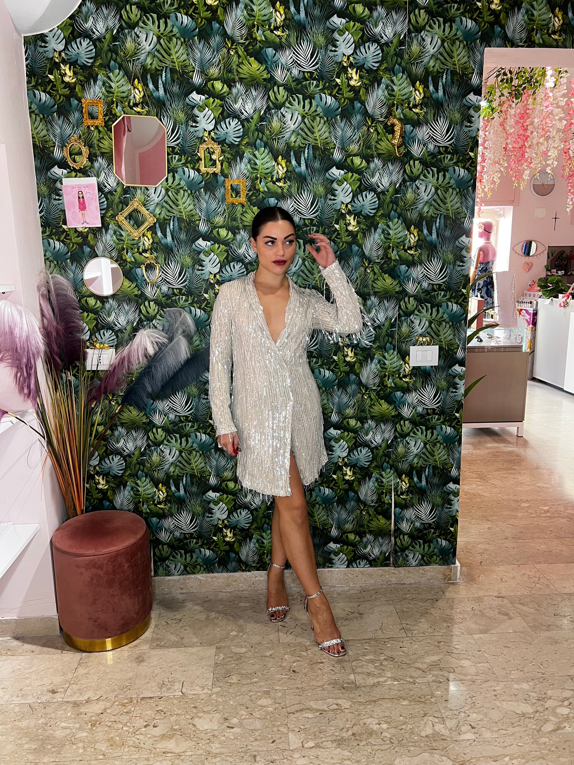 L'elegante abito blazer Blazer Shine è l'essenza dello stile e della luminosità. Caratterizzato da un design luccicante e frange adornate con pailettes, ti farà risplendere in ogni occasione. Aggiungi un tocco di lusso e glamour al tuo guardaroba.