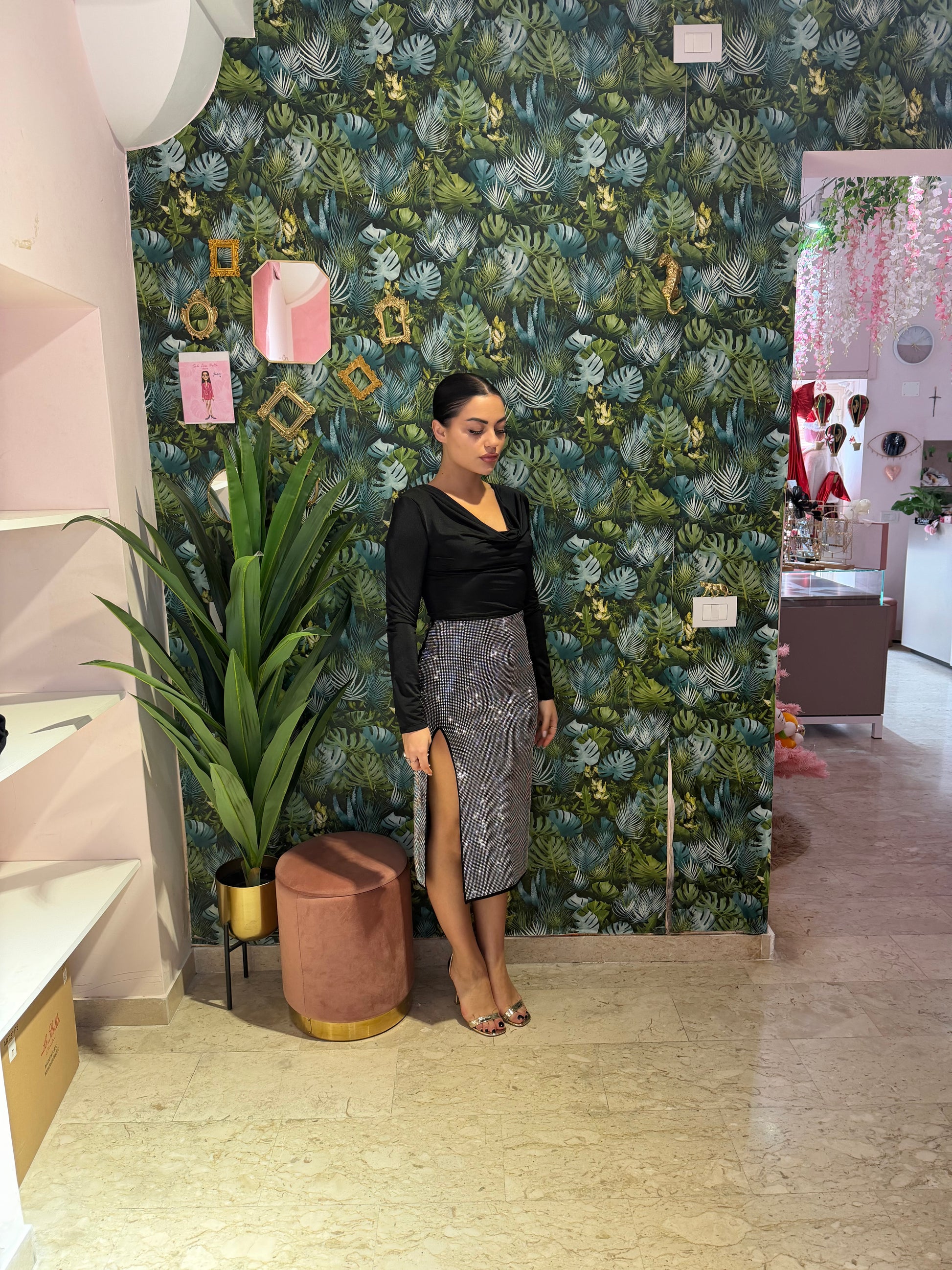 Combina eleganza e modernità con il Completo Samira 2.0. Il micro top accentua le forme, mentre la gonna luccicante dona un tocco di glamour. Ideale per serate speciali, rende ogni momento unico ed esclusivo.