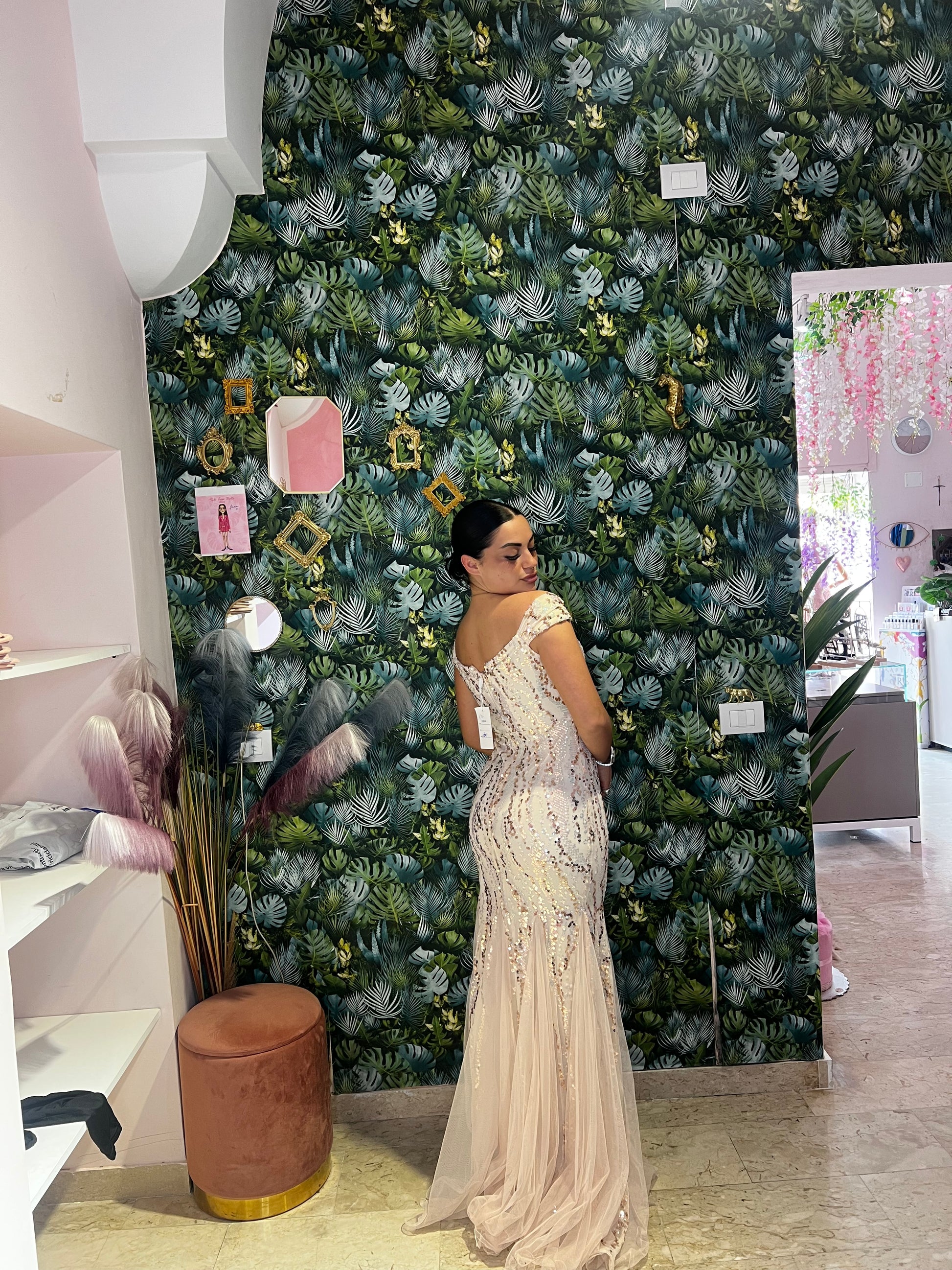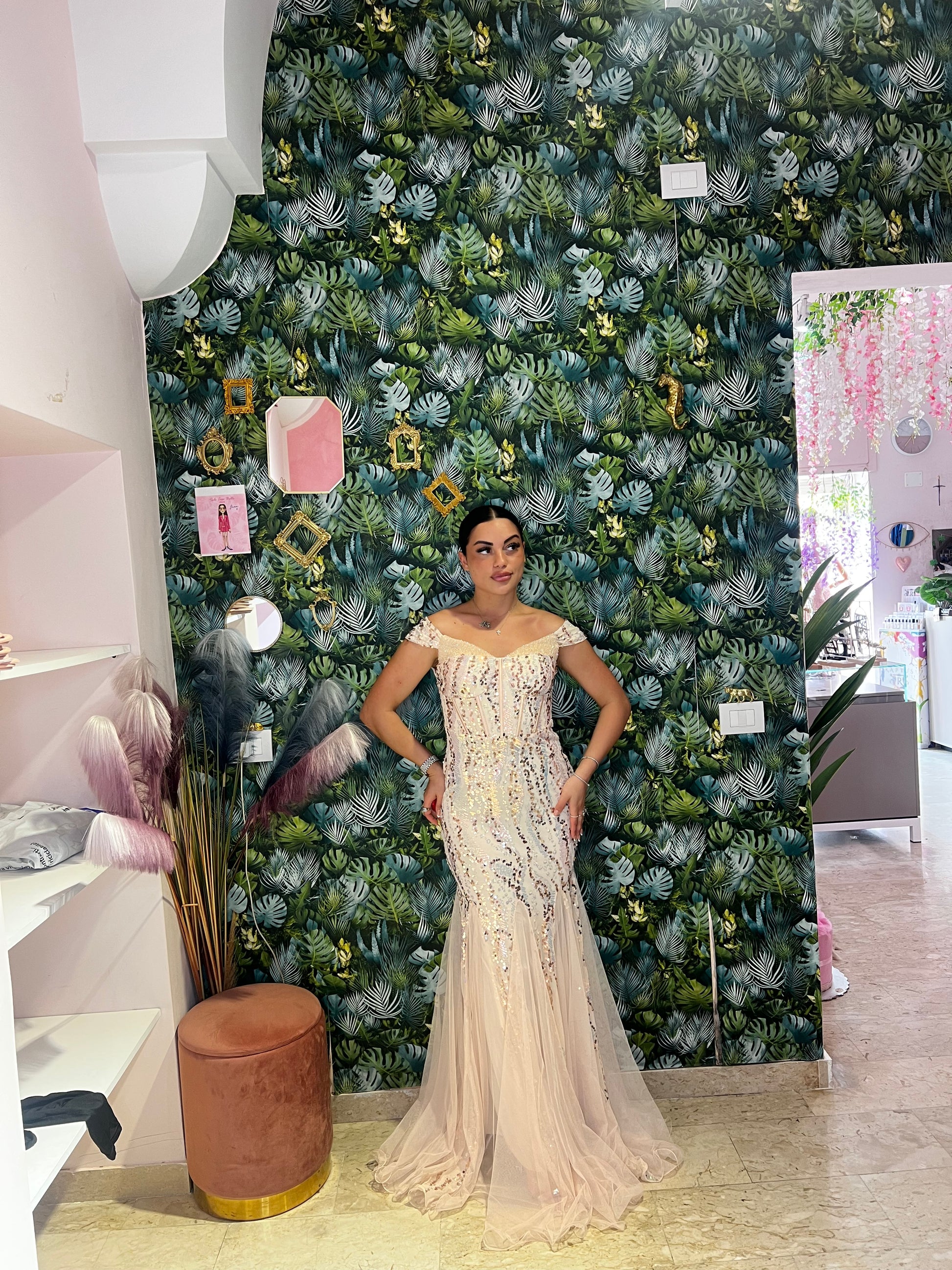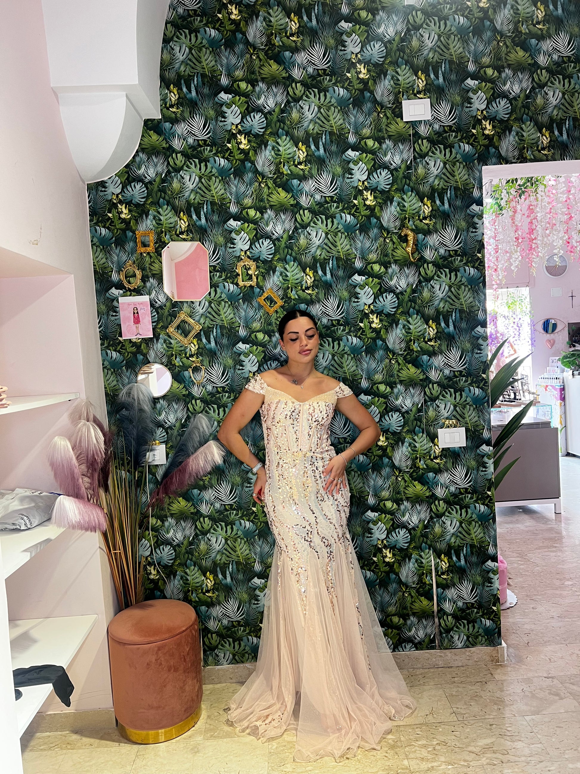 L'abito Flaminia è un sogno diventato realtà per qualsiasi cerimonia. Elegante con paillettes e pietre luccicanti, la sua gonna in tulle e l'effetto sirena ti faranno sentire bellissima. Il tuo look da principessa è garantito al 100%.