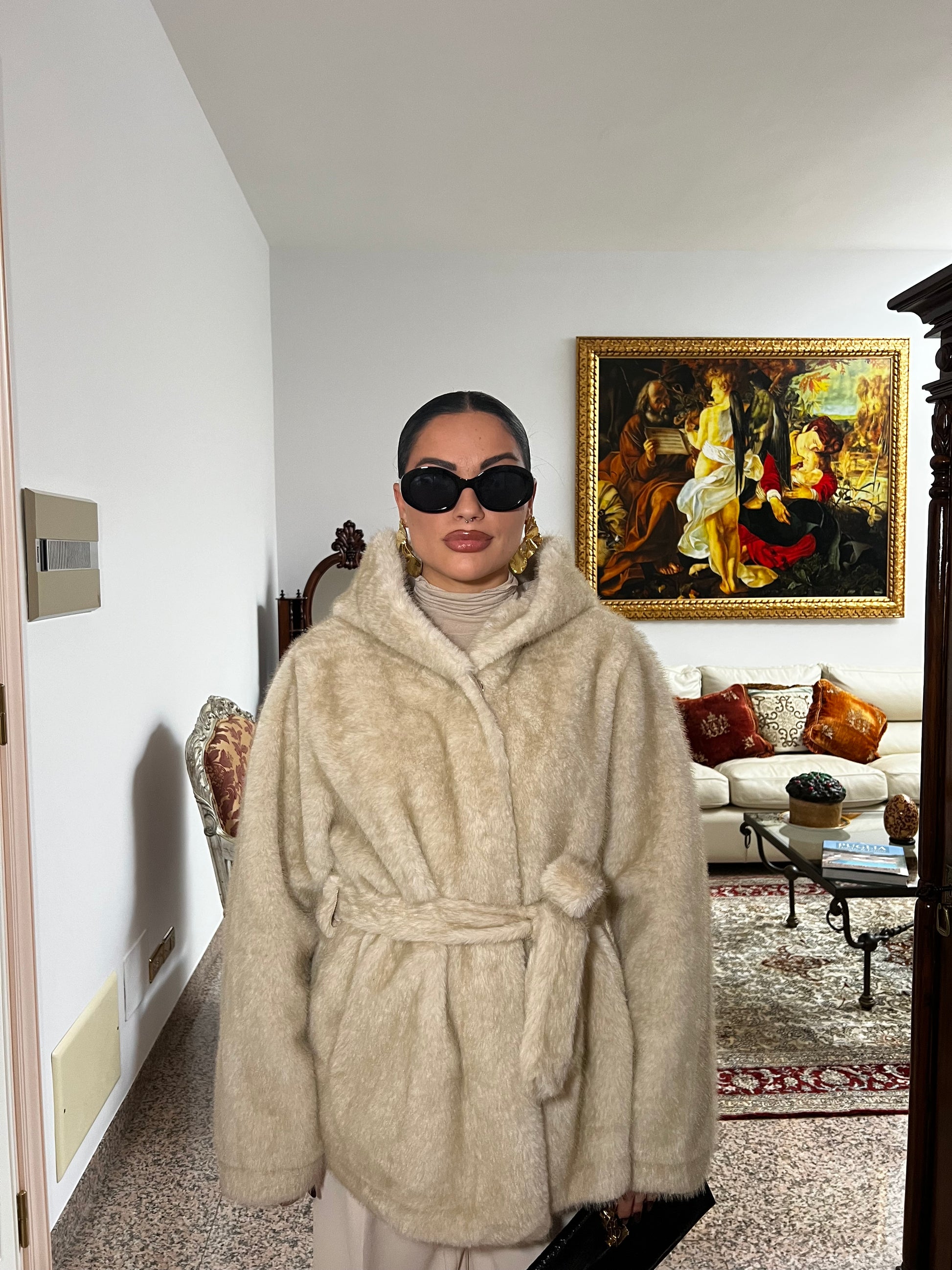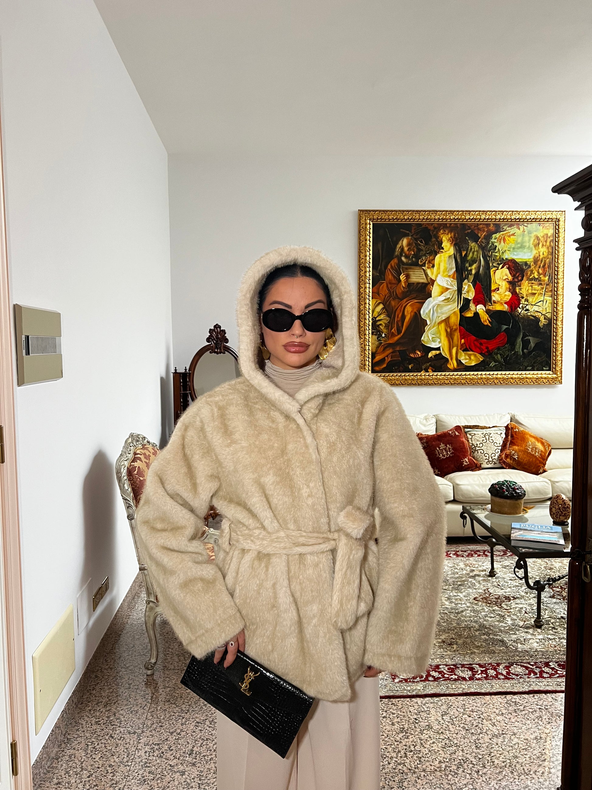 L'eco pelliccia Selene è un'elegante scelta di moda etica. Con un cappuccio morbido e una cintura regolabile, offre il massimo comfort e stile.